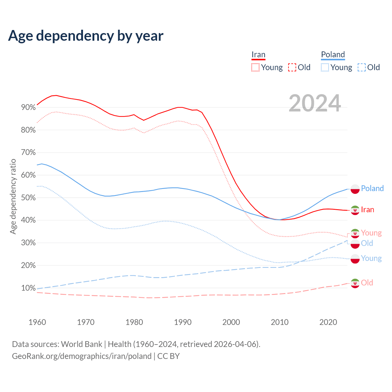 - The share of old-age demographic (65+) in Iran is 8.24% vs 20.1% in Poland.