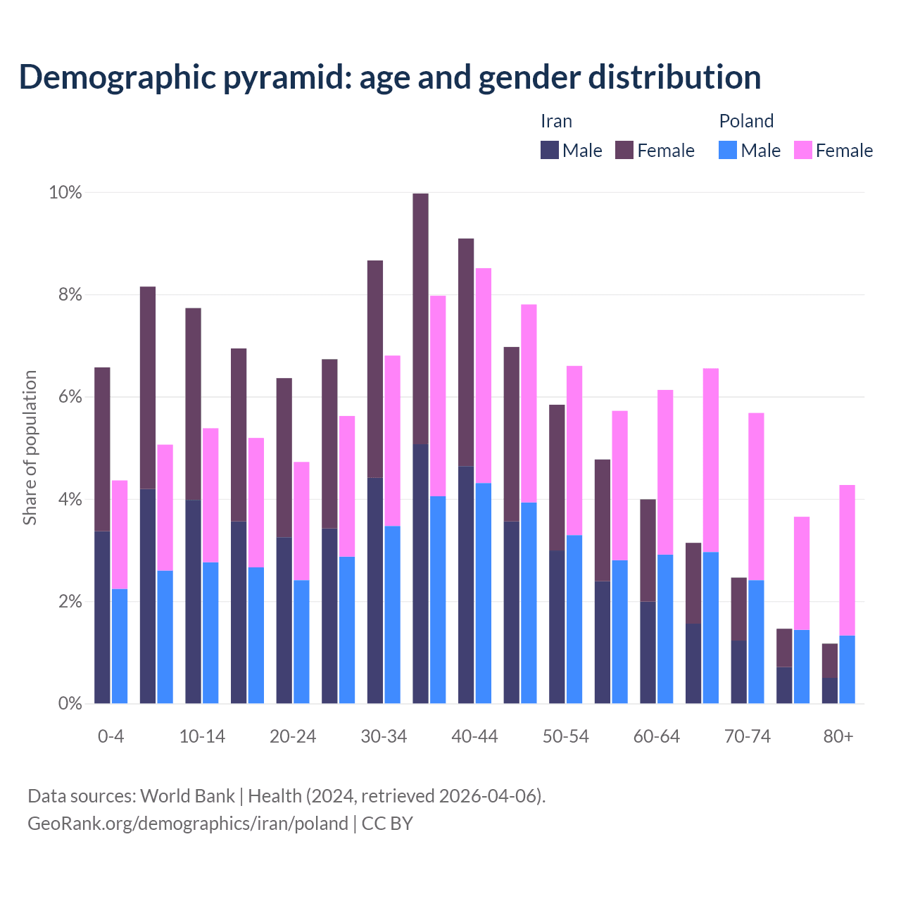 - Iran is ranked 79/196 by median age (oldest to youngest) vs 30/196 for Poland.