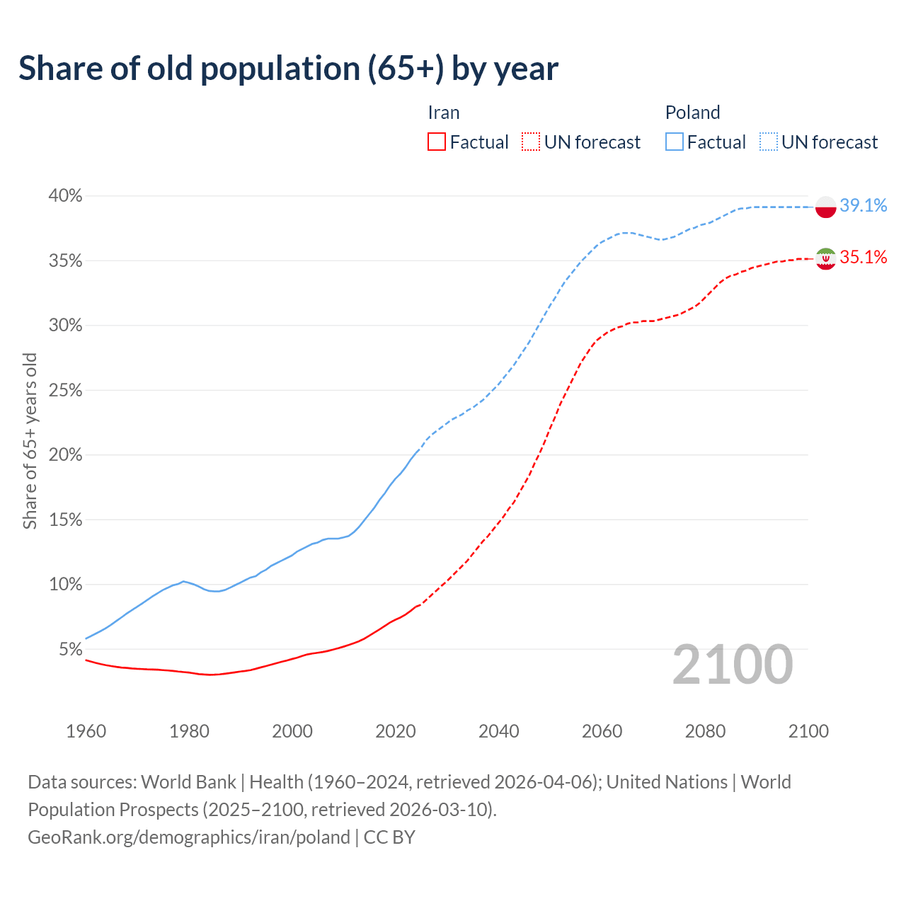 The share of older people aged 65 and over is 8.24% in Iran and 20.1% in Poland. Life expectancy in Iran compared to Poland .