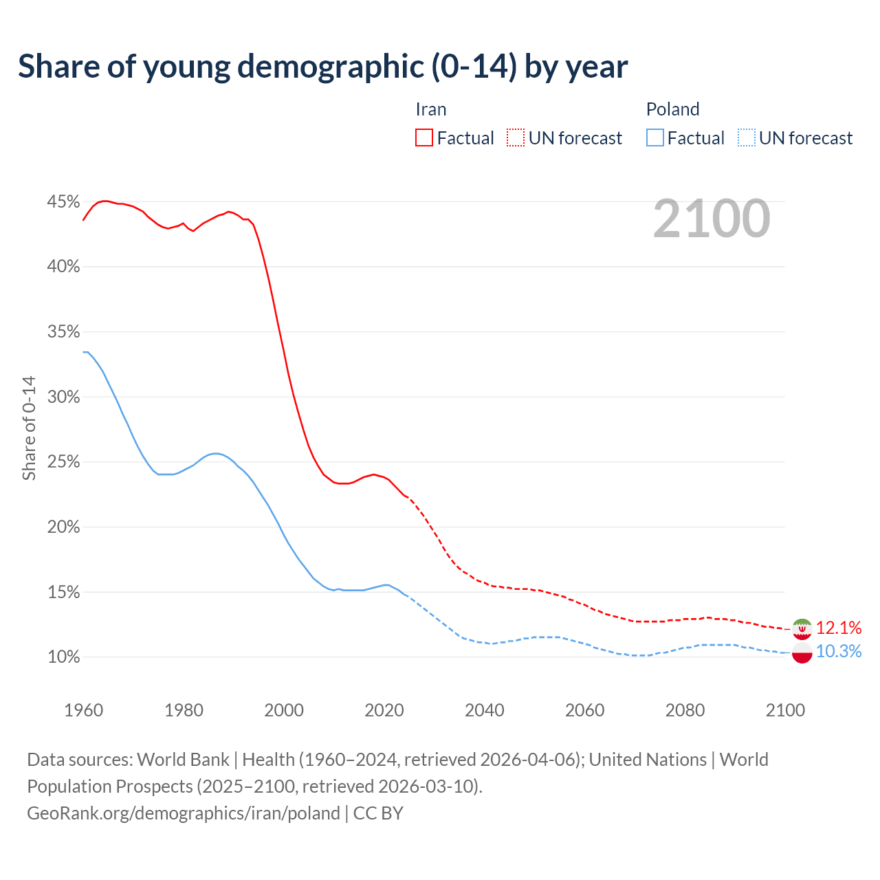 - The share of young demographic (0-15 years old) in Iran is 22.4% vs 14.8% in Poland.