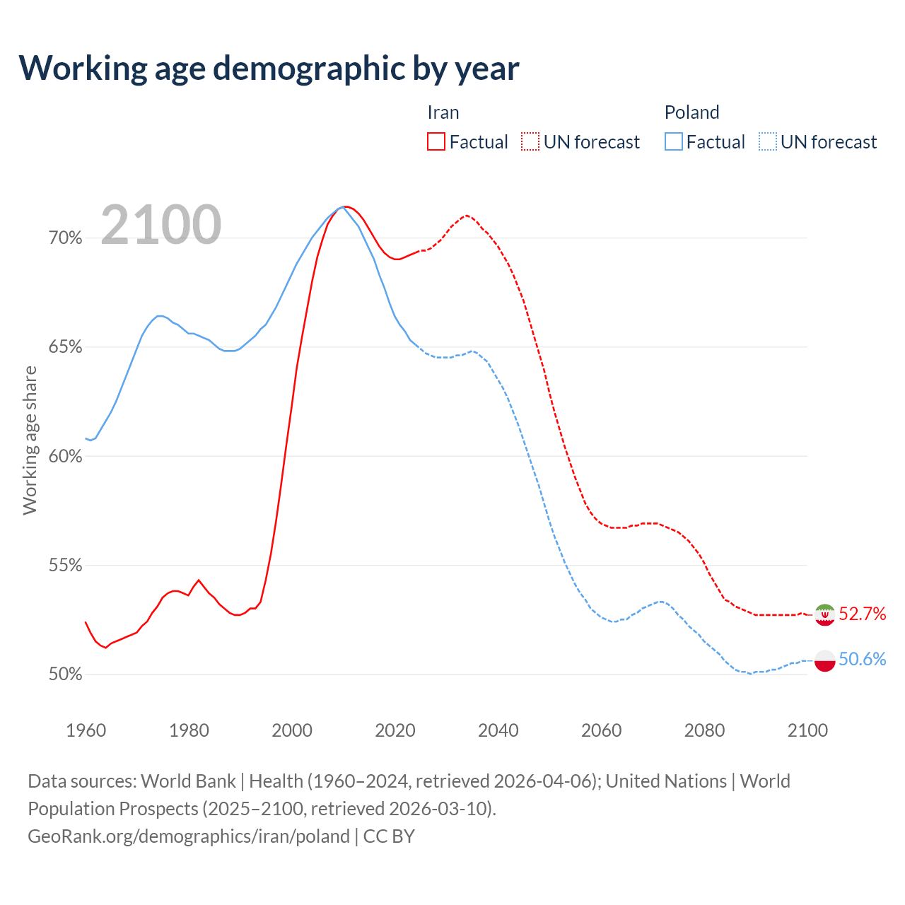 - Iran has 64.8M working age adults (aged 15-64) vs 23.3M in Poland.