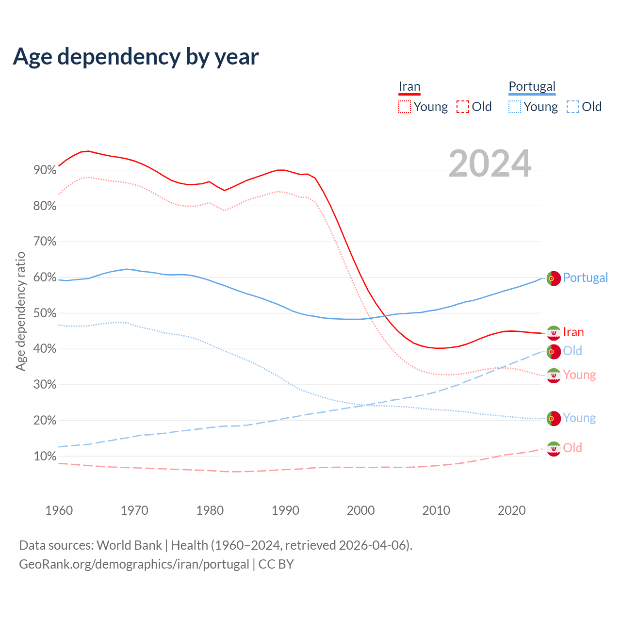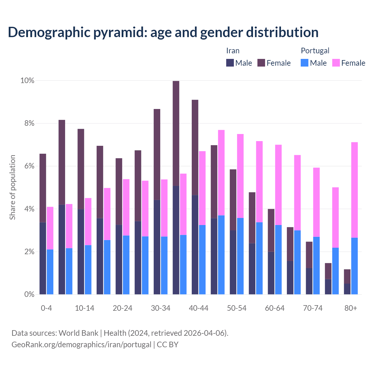 - Iran is ranked 79/196 by median age (oldest to youngest) vs 5/196 for Portugal.