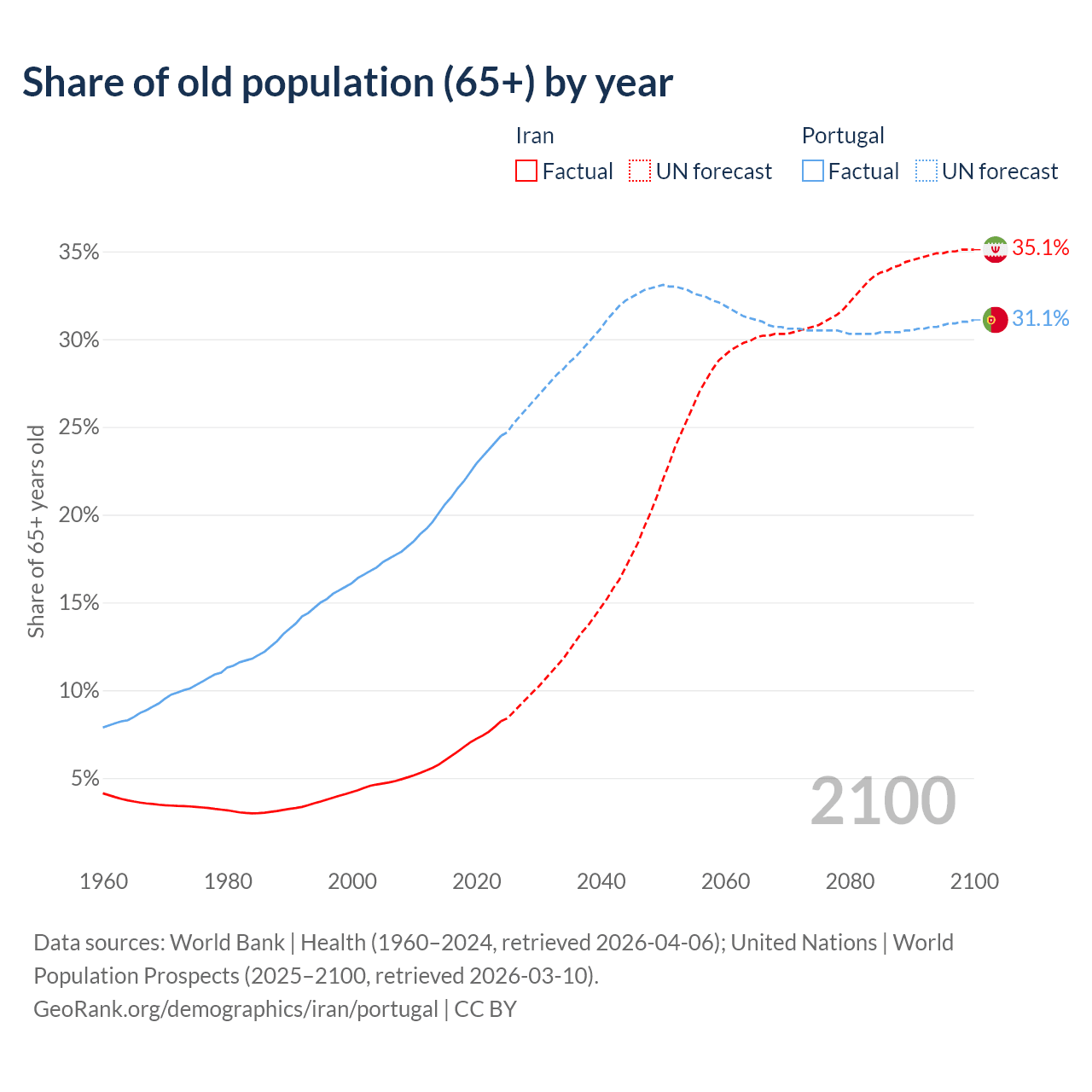 - The share of old-age demographic (65+) in Iran is 8.24% vs 24.5% in Portugal.