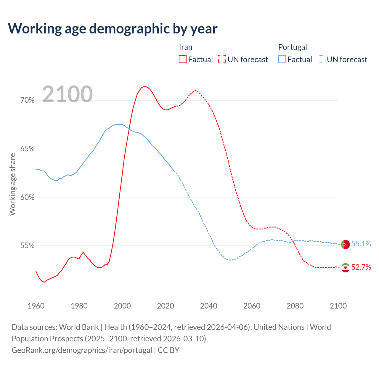 - Iran has 64.8M working age adults (aged 15-64) vs 6.68M in Portugal.