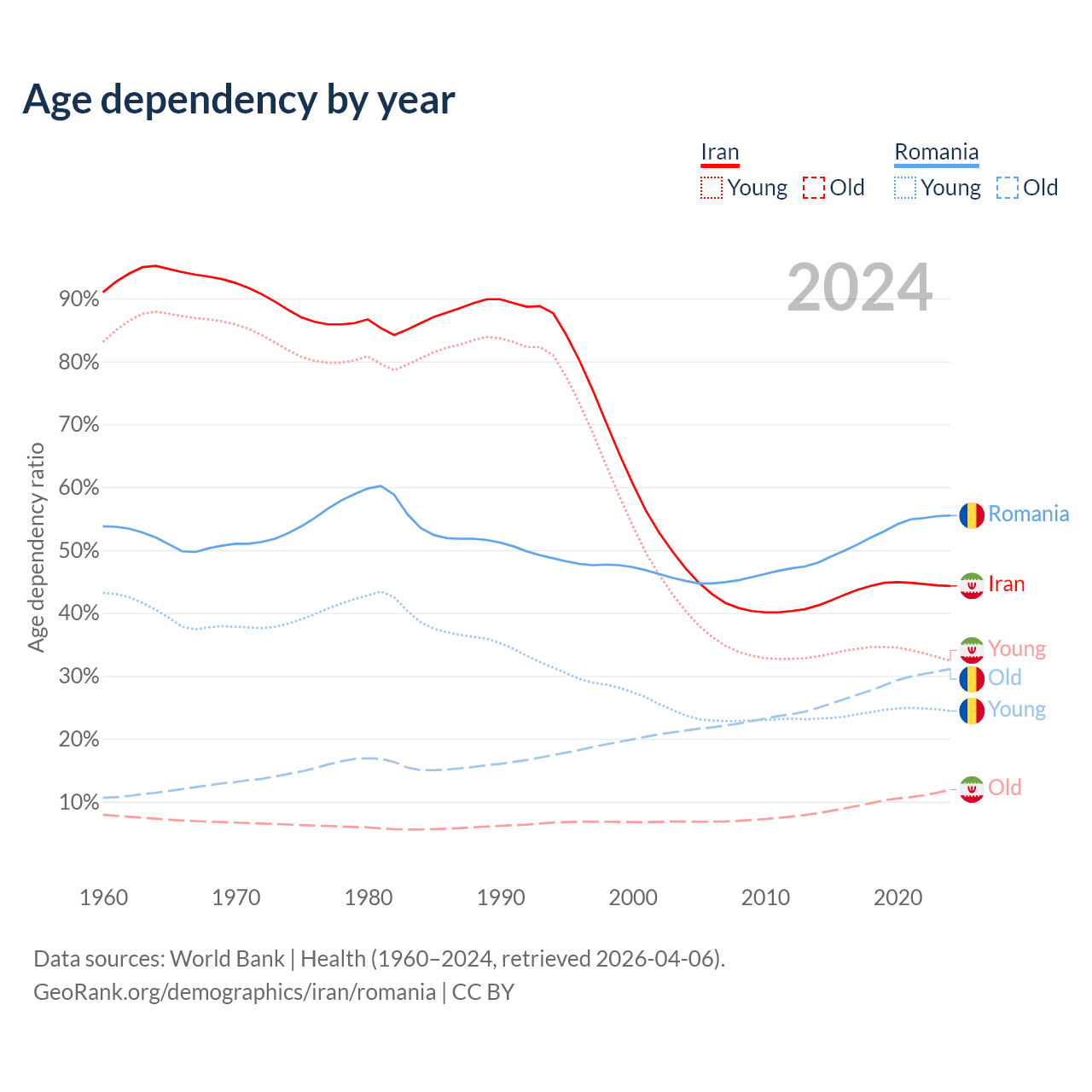 - Iran is ranked 79/196 by median age (oldest to youngest) vs 23/196 for Romania.