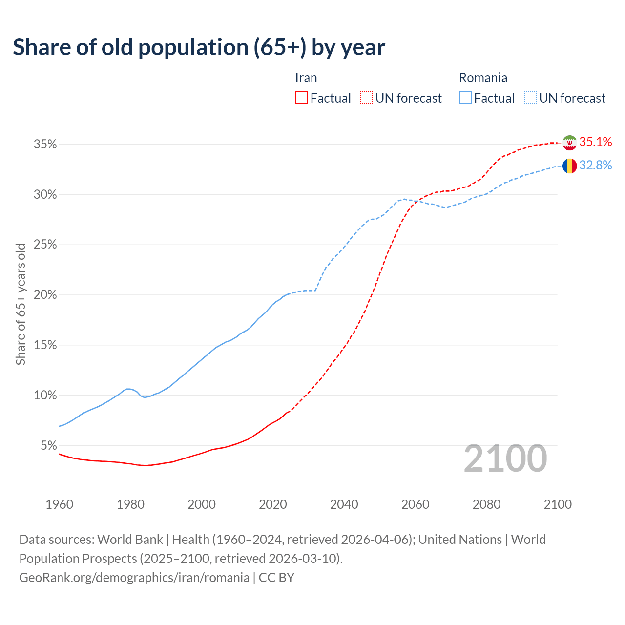 The share of older people aged 65 and over is 8.24% in Iran and 20% in Romania. Life expectancy in Iran compared to Romania .