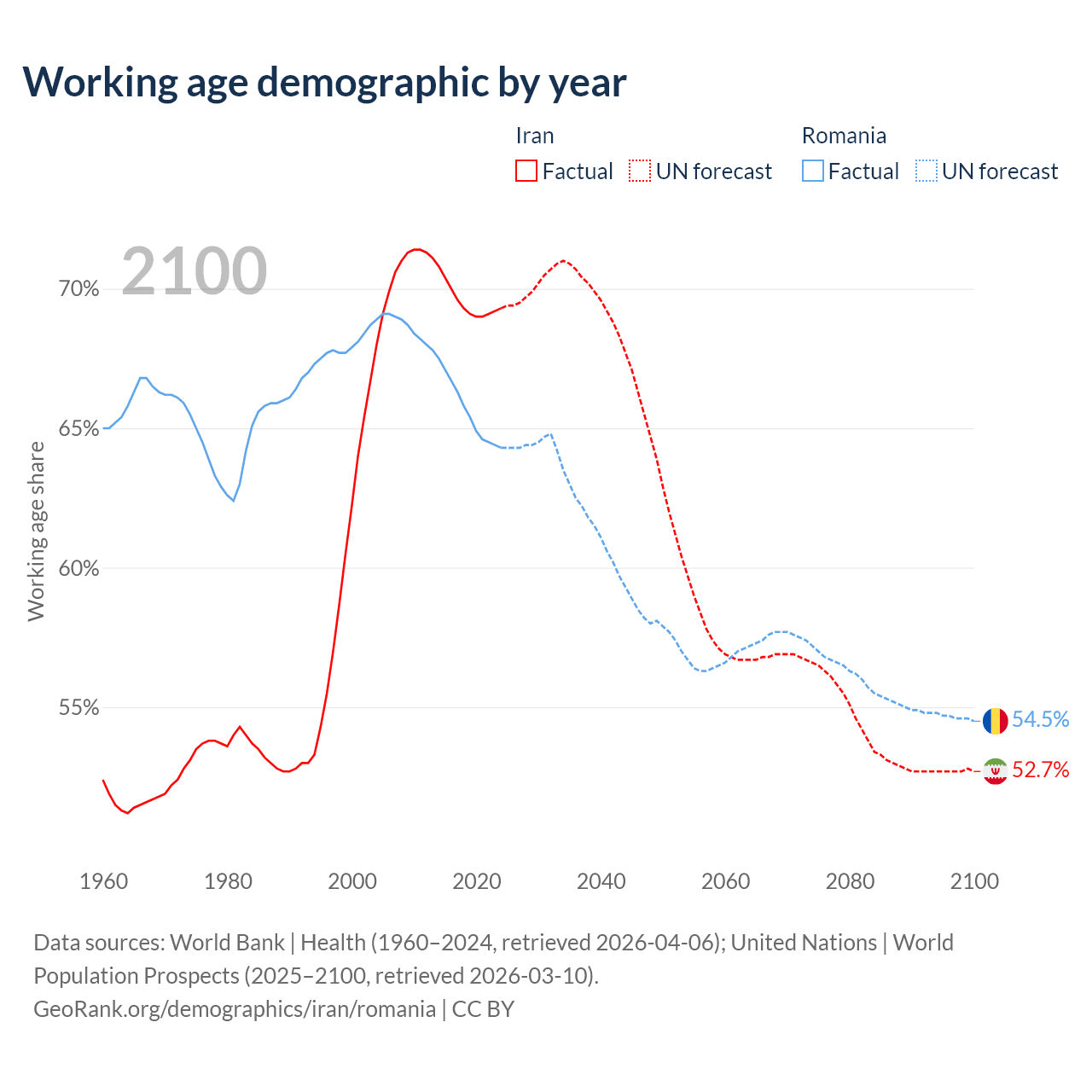 - Iran has 64.8M working age adults (aged 15-64) vs 12.1M in Romania.
