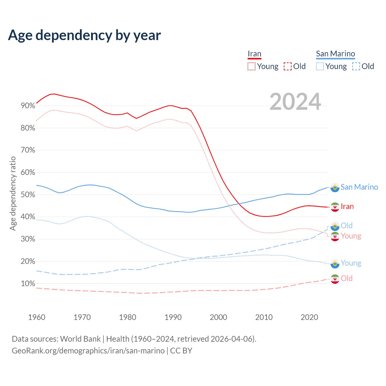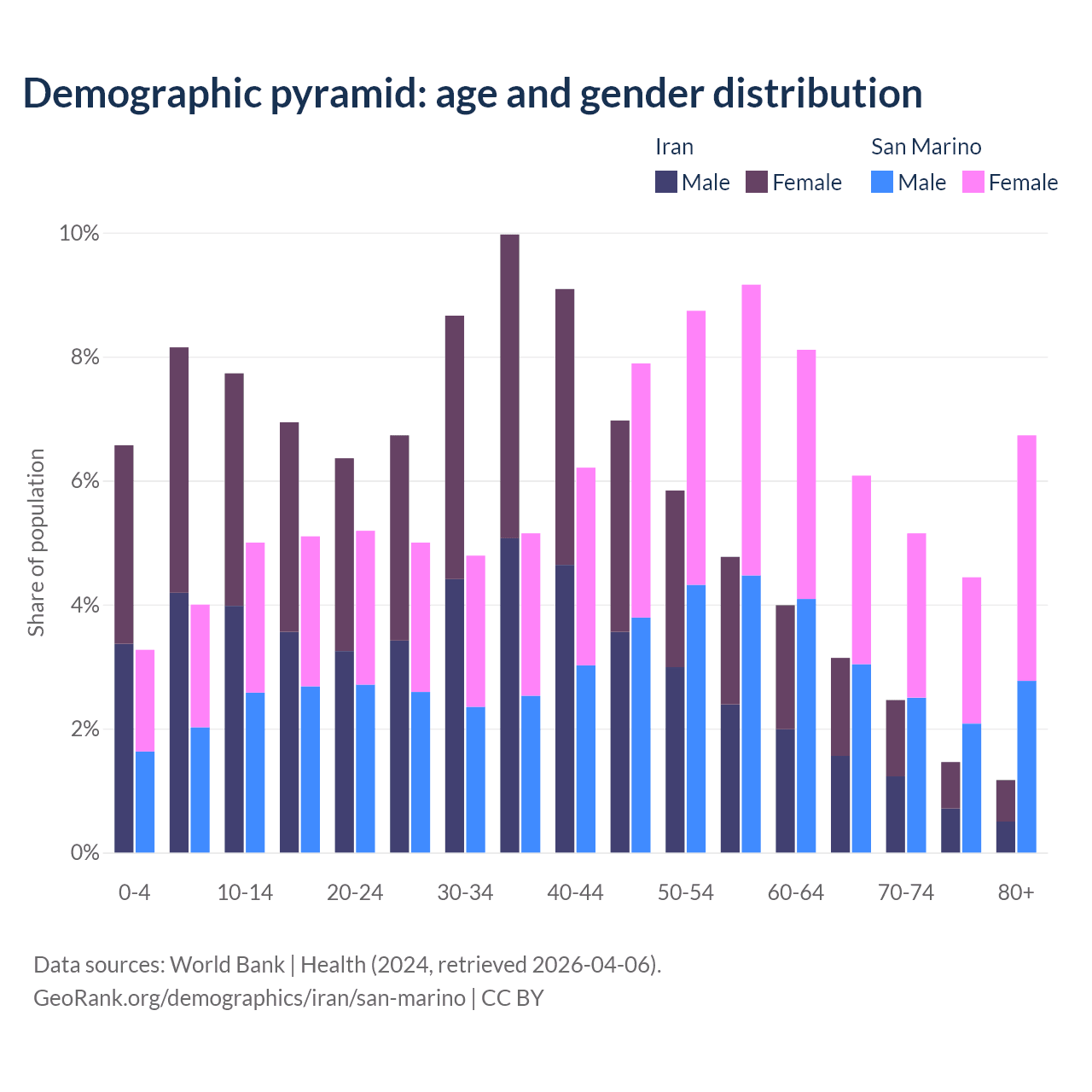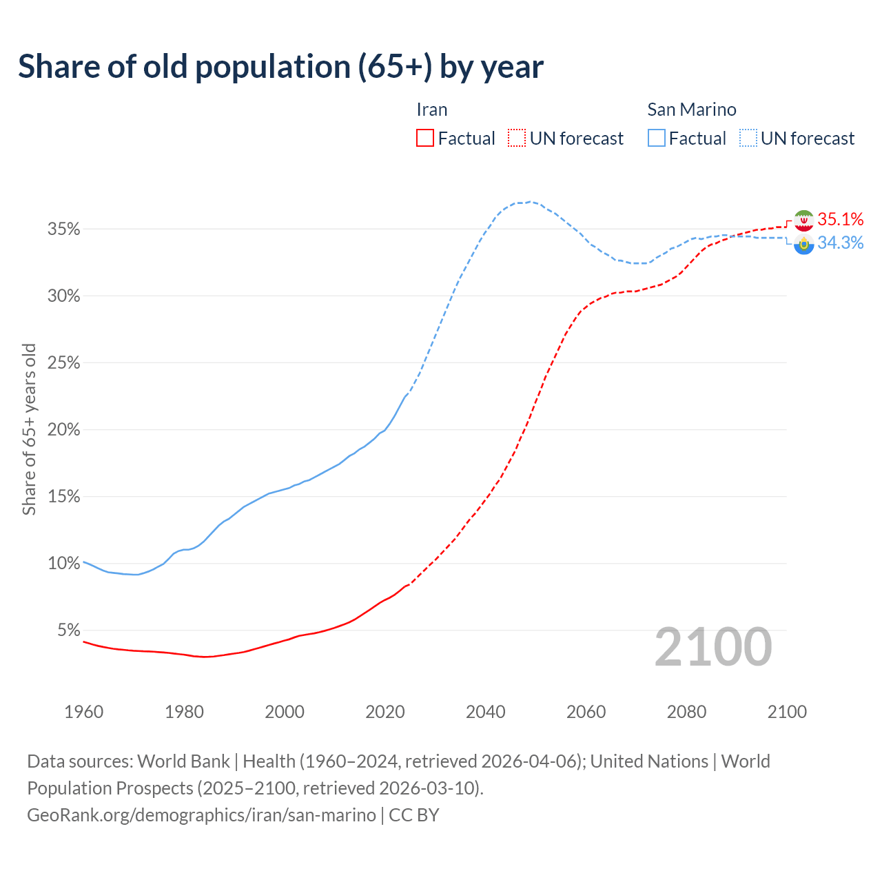 - The share of old-age demographic (65+) in Iran is 8.24% vs 22.4% in San Marino.