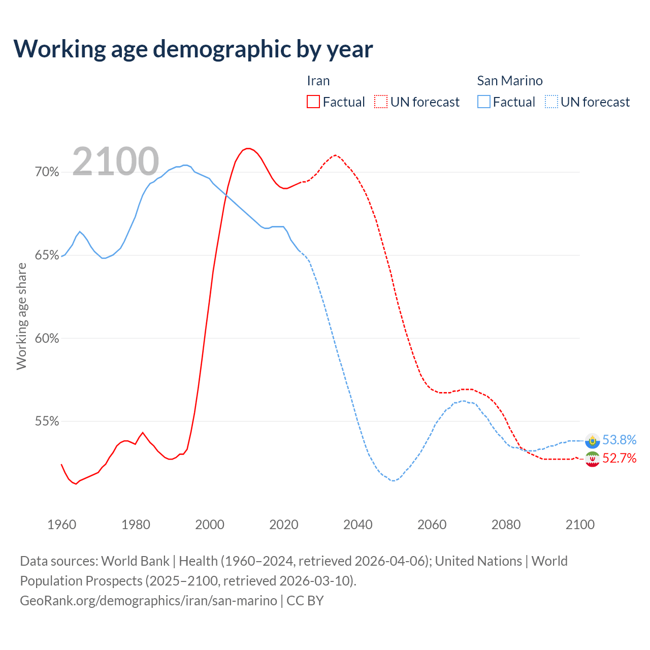 - Iran has 64.8M working age adults (aged 15-64) vs 22.2K in San Marino.