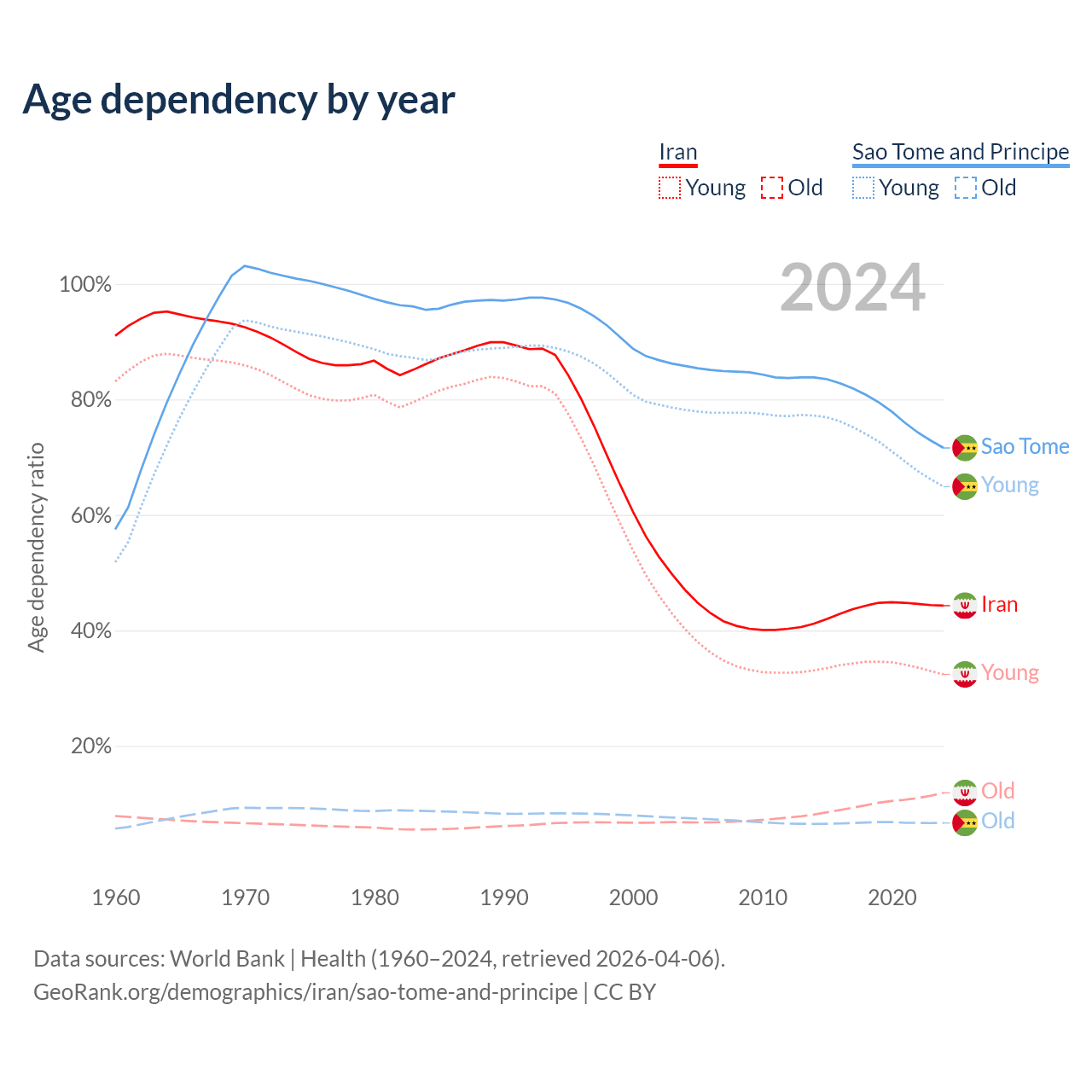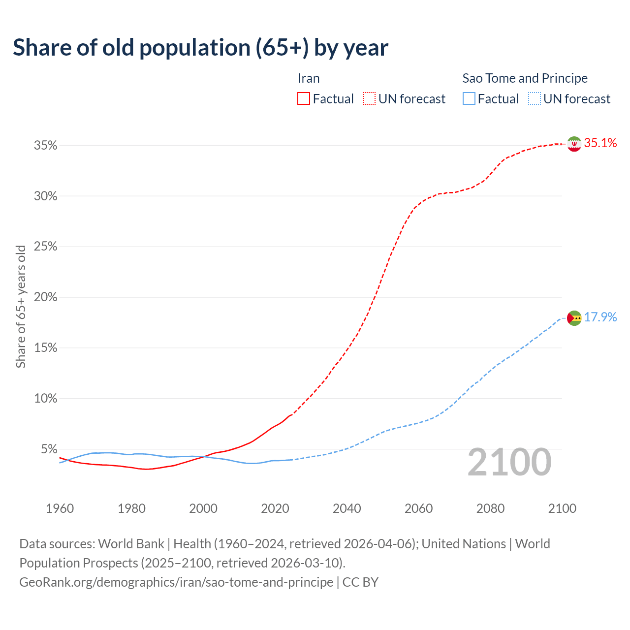 - The share of old-age demographic (65+) in Iran is 8.24% vs 3.9% in Sao Tome and Principe.