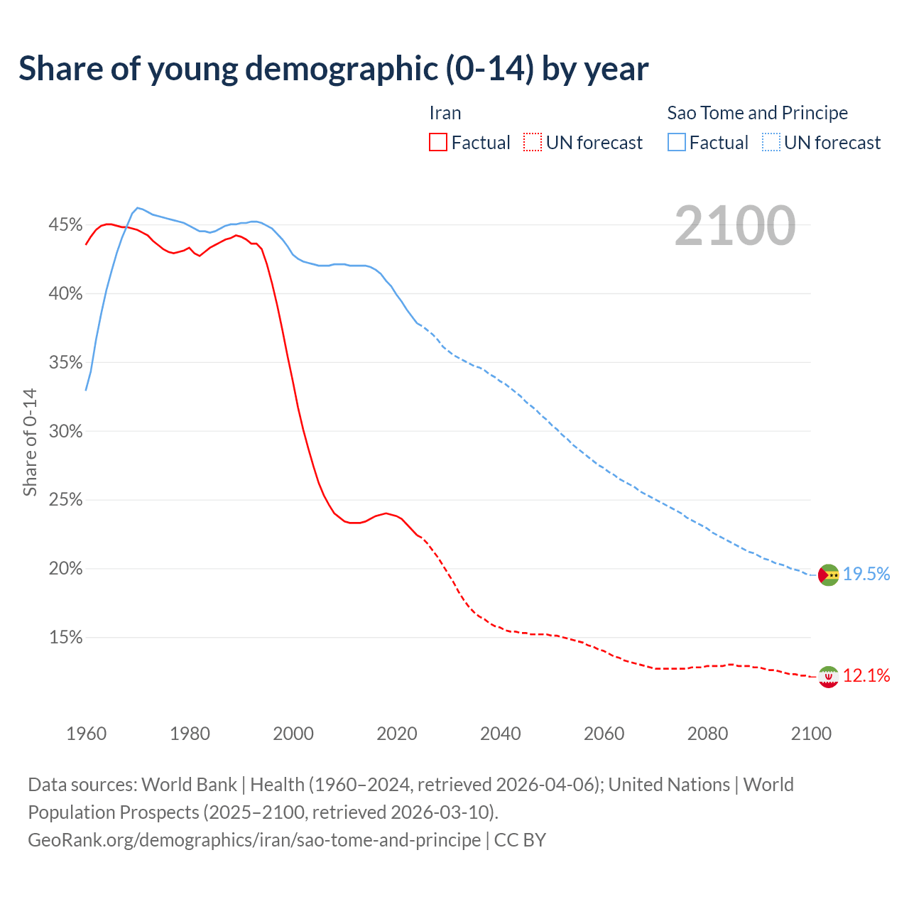 - The share of young demographic (0-15 years old) in Iran is 22.4% vs 37.8% in Sao Tome and Principe.