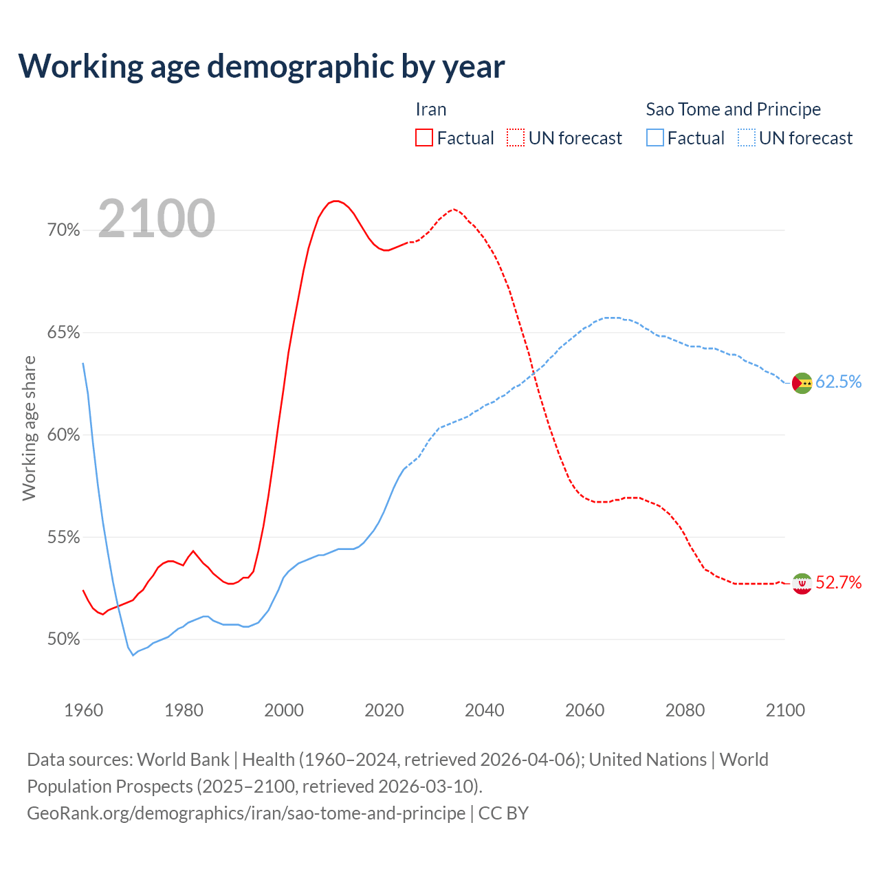 - Iran has 64.8M working age adults (aged 15-64) vs 144K in Sao Tome and Principe.