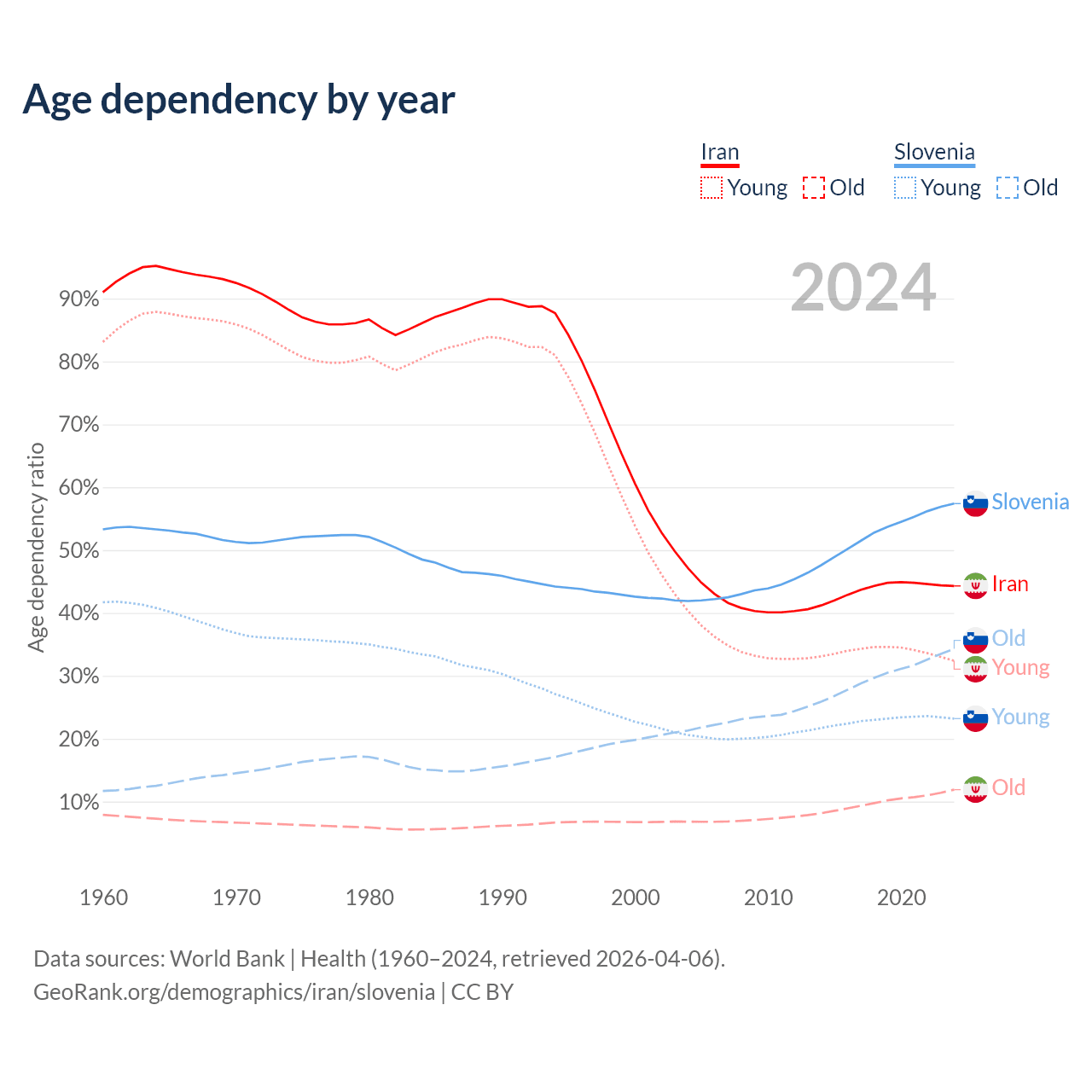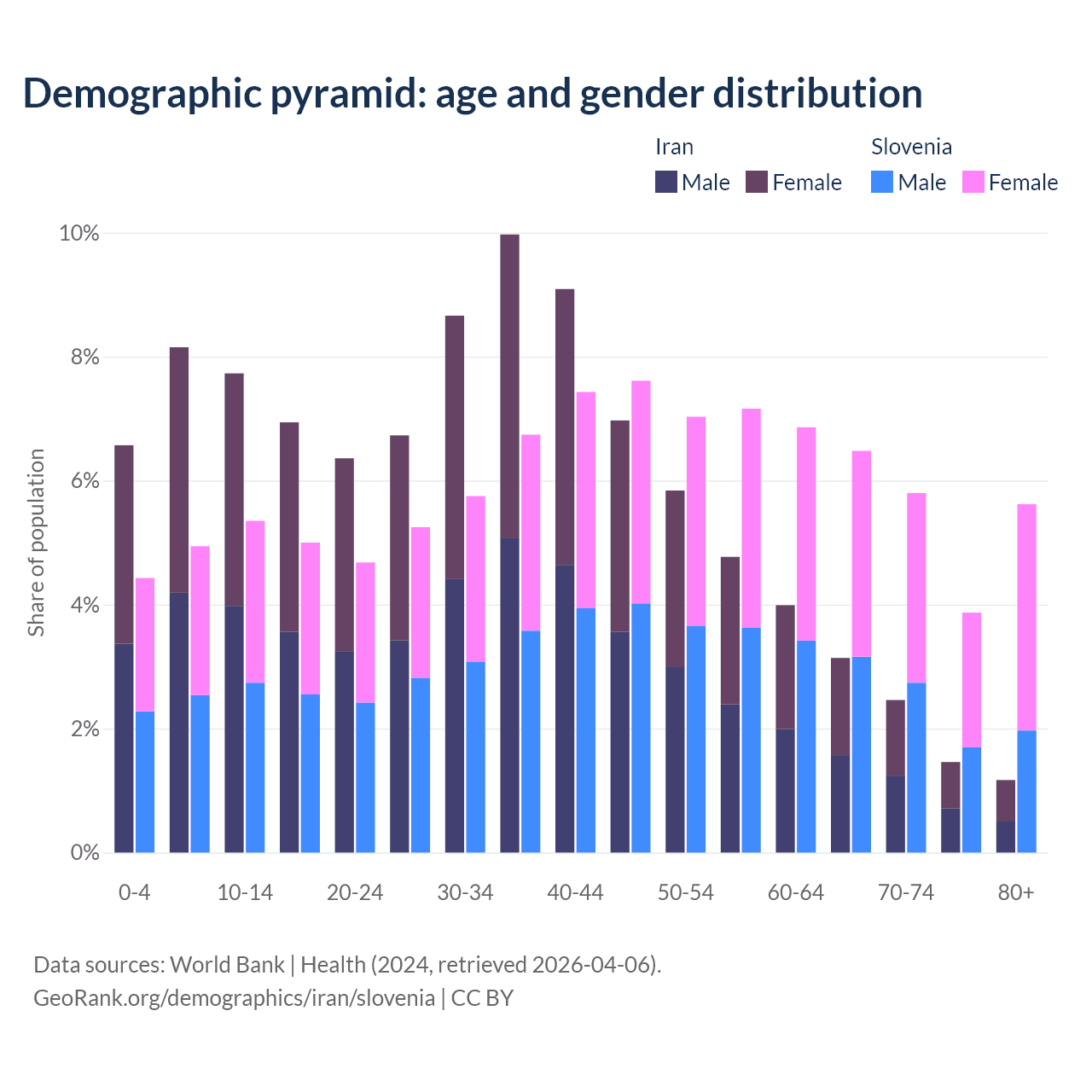- Iran is ranked 79/196 by median age (oldest to youngest) vs 14/196 for Slovenia.