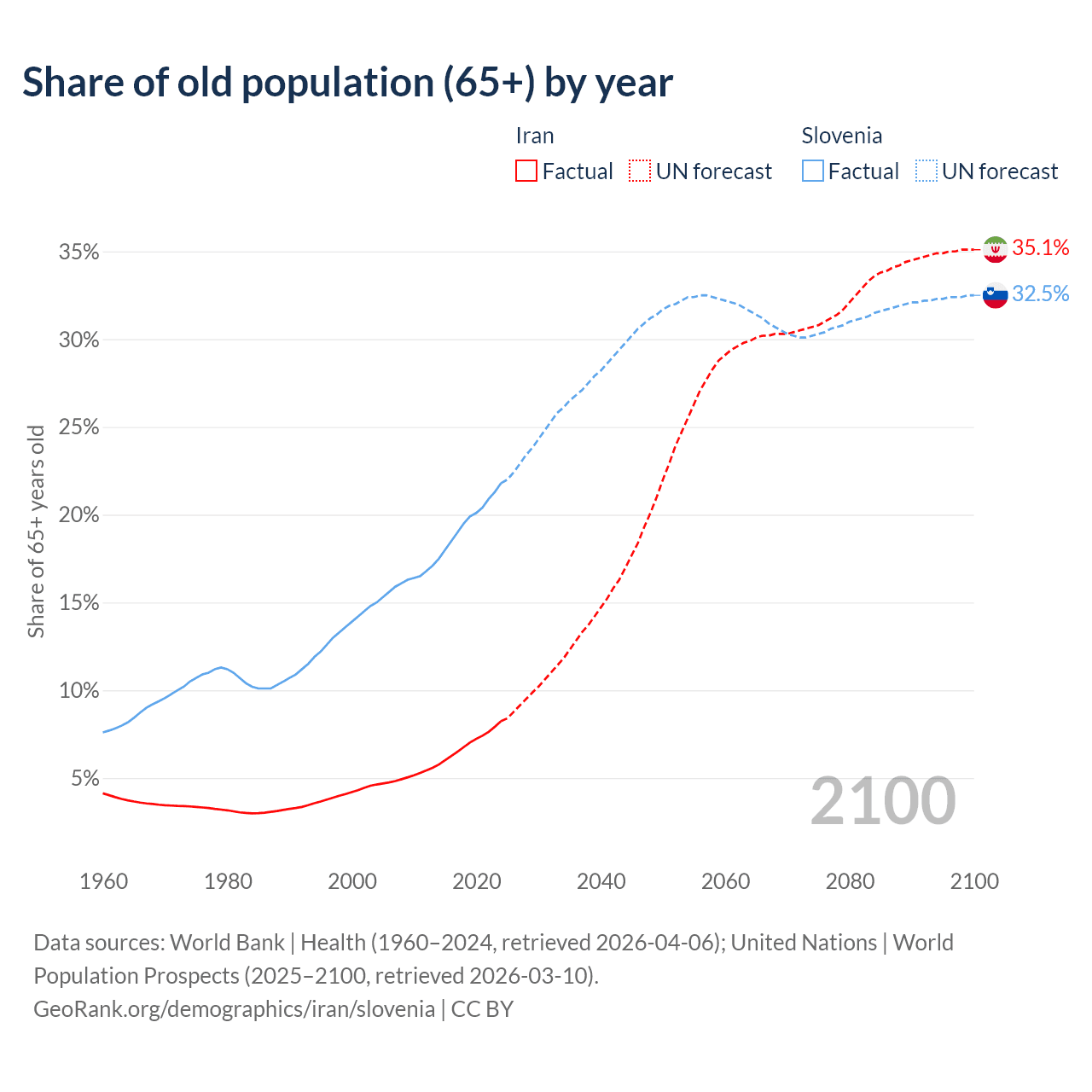 The share of older people aged 65 and over is 8.24% in Iran and 21.8% in Slovenia. Life expectancy in Iran compared to Slovenia .