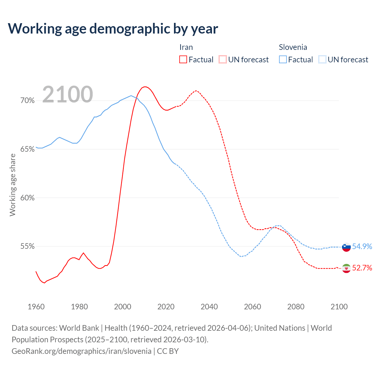 - Iran has 64.8M working age adults (aged 15-64) vs 1.35M in Slovenia.