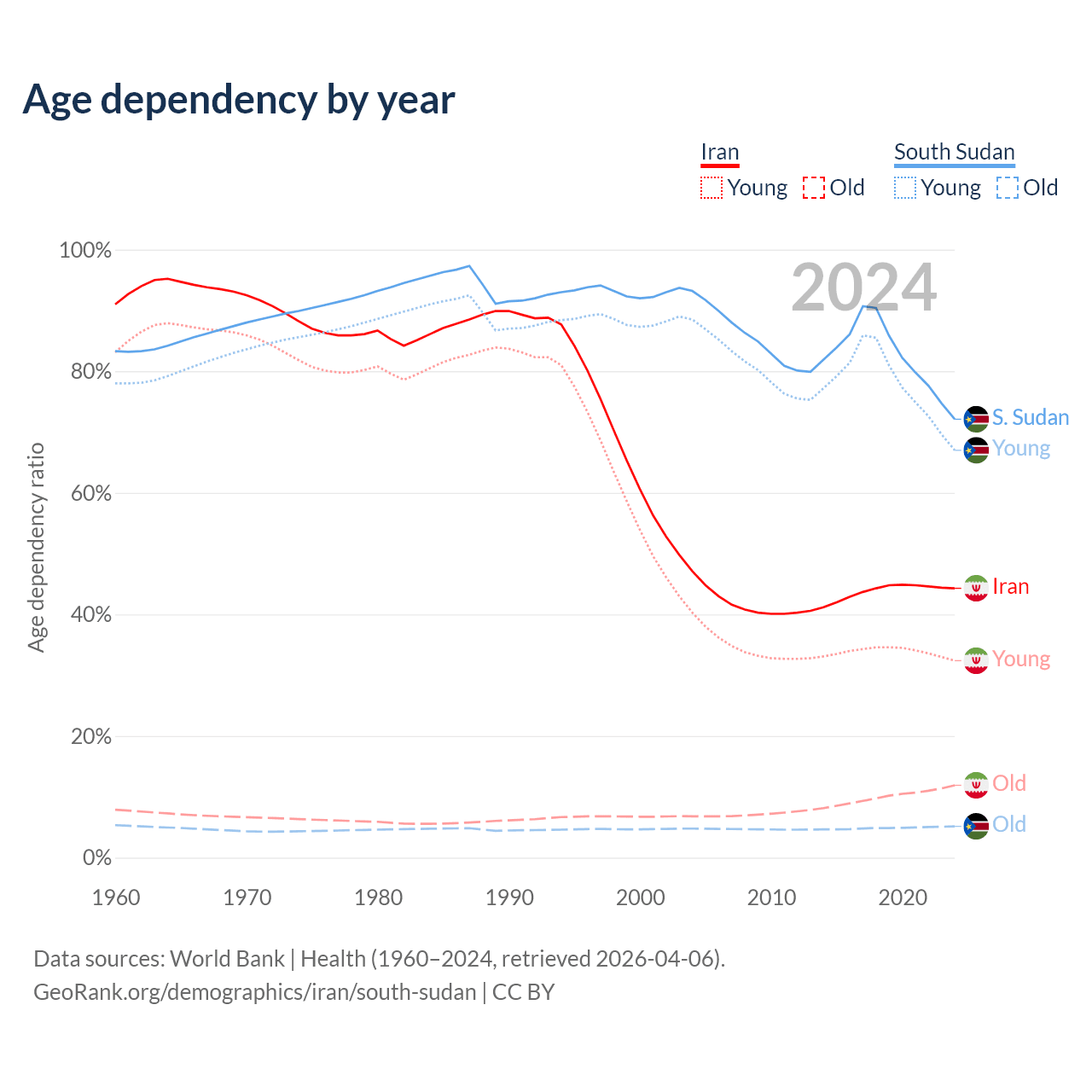 - Iran is ranked 79/196 by median age (oldest to youngest) vs 173/196 for South Sudan.