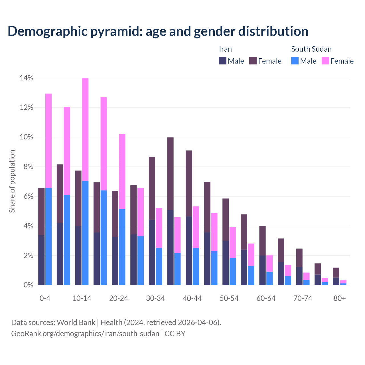 - As of 2026, the population of Iran is 93.5M vs 12.5M in South Sudan - 7.47 times difference.