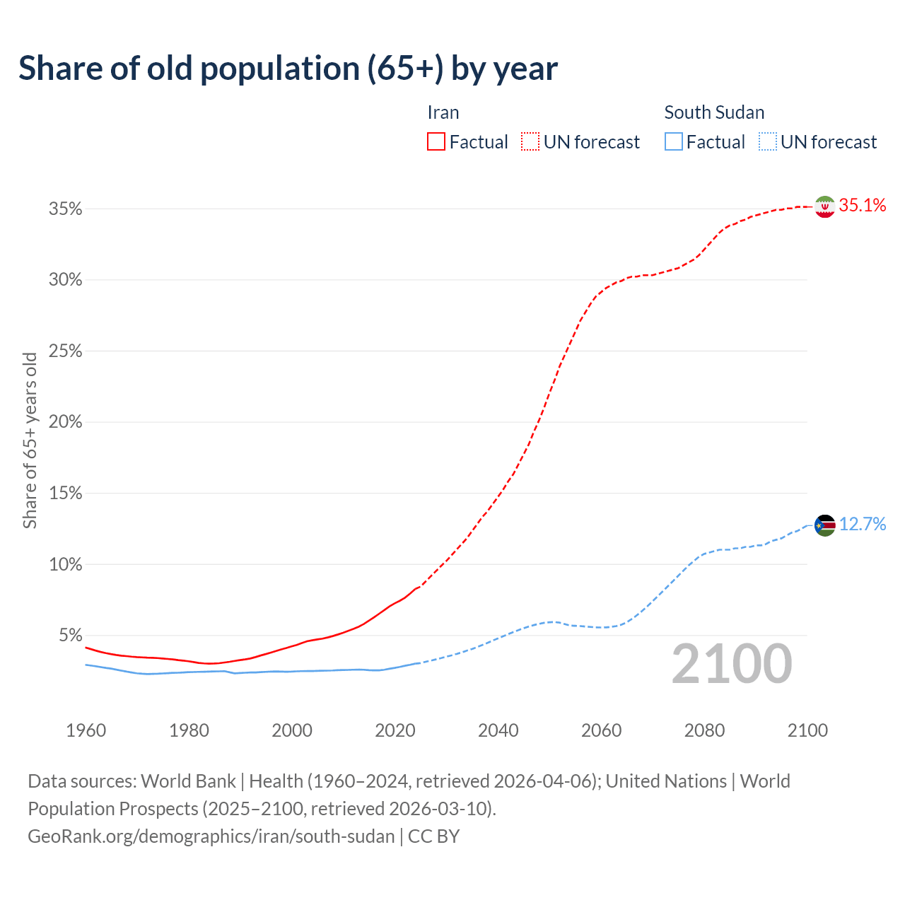 The share of older people aged 65 and over is 8.24% in Iran and 2.99% in South Sudan. Life expectancy in Iran compared to South Sudan .