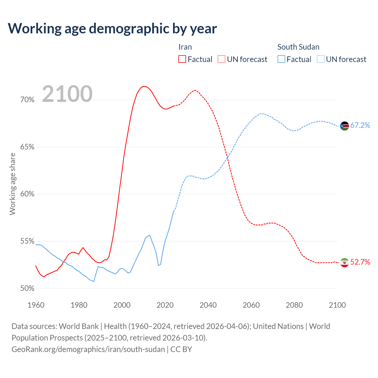 - Iran has 64.8M working age adults (aged 15-64) vs 7.27M in South Sudan.