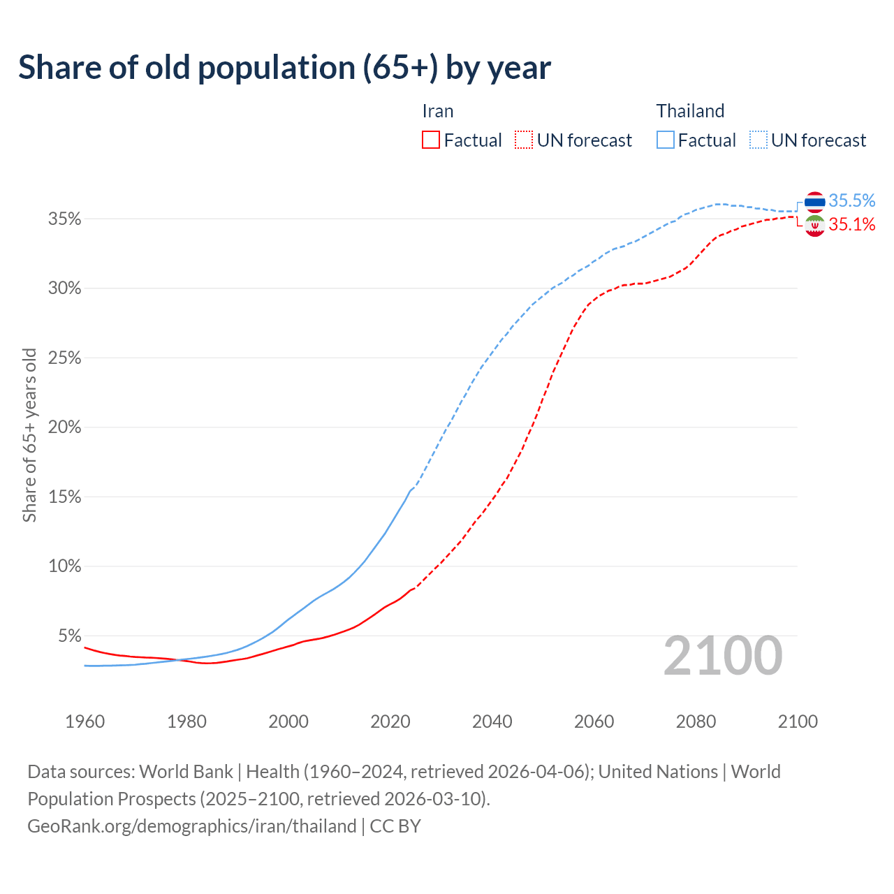 Median age Iran vs Thailand, 1960-2100