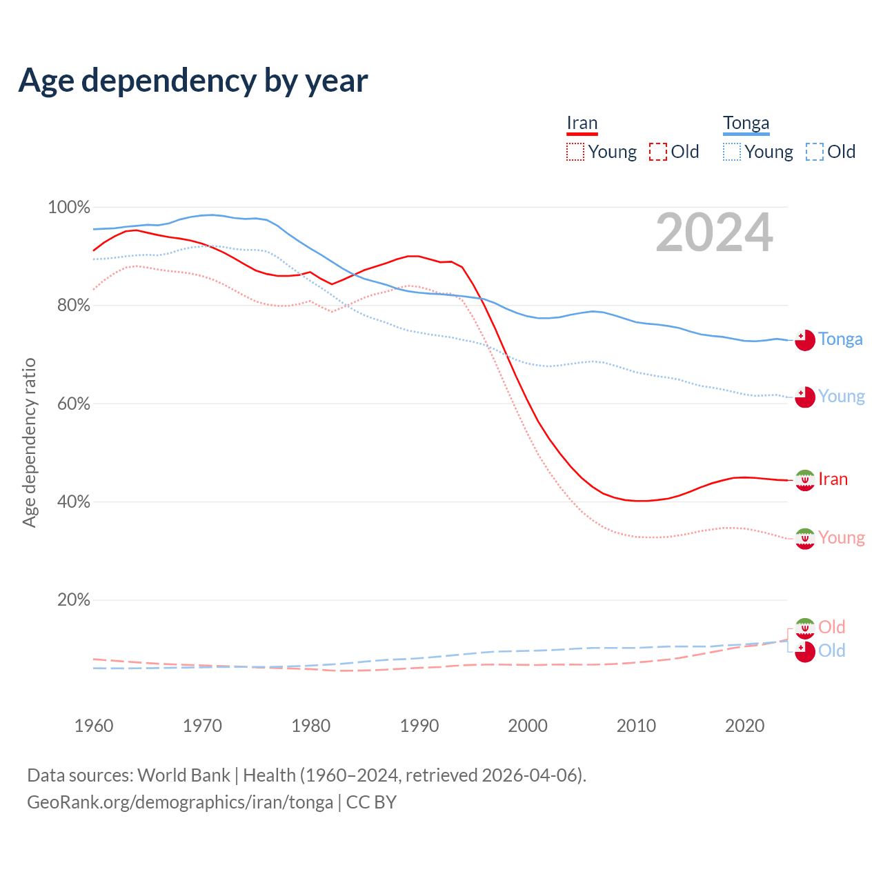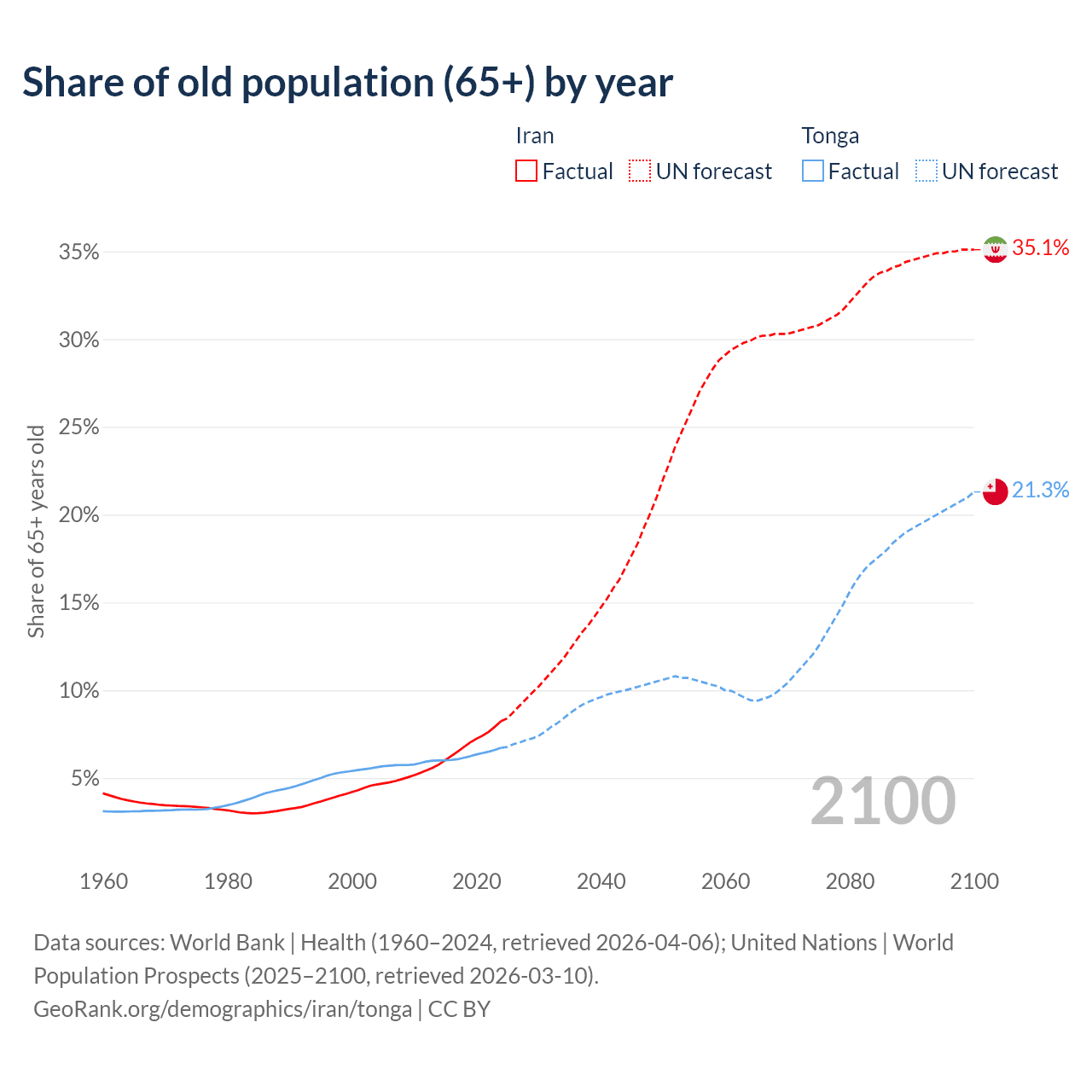 - The share of old-age demographic (65+) in Iran is 8.24% vs 6.72% in Tonga.