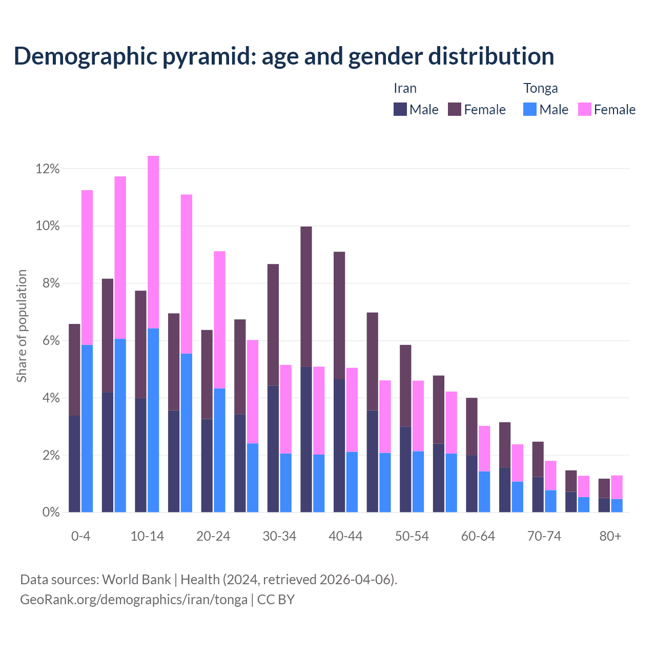 - As of 2026, the population of Iran is 93.5M vs 103K in Tonga - 905 times difference.
