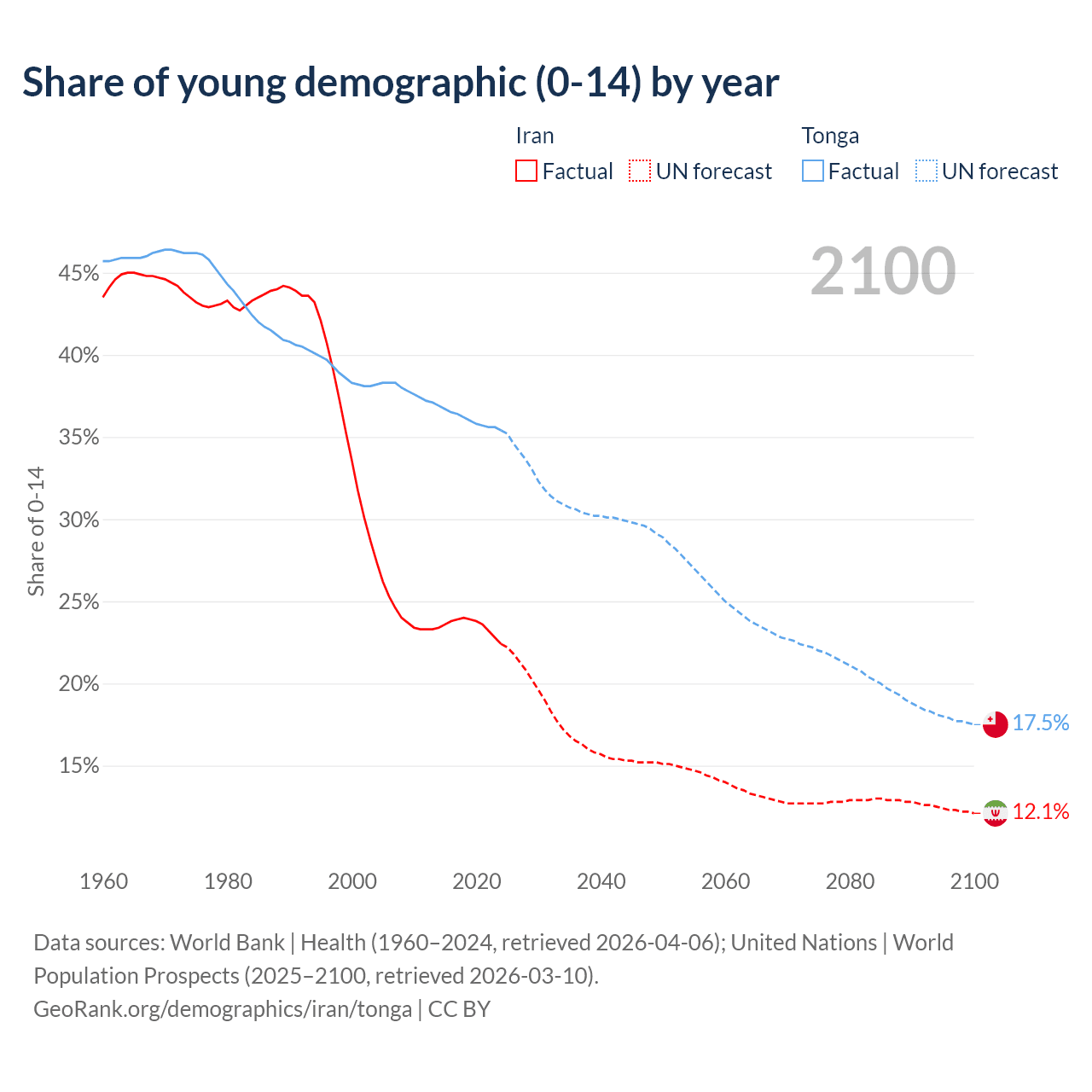 - The share of young demographic (0-15 years old) in Iran is 22.4% vs 35.4% in Tonga.