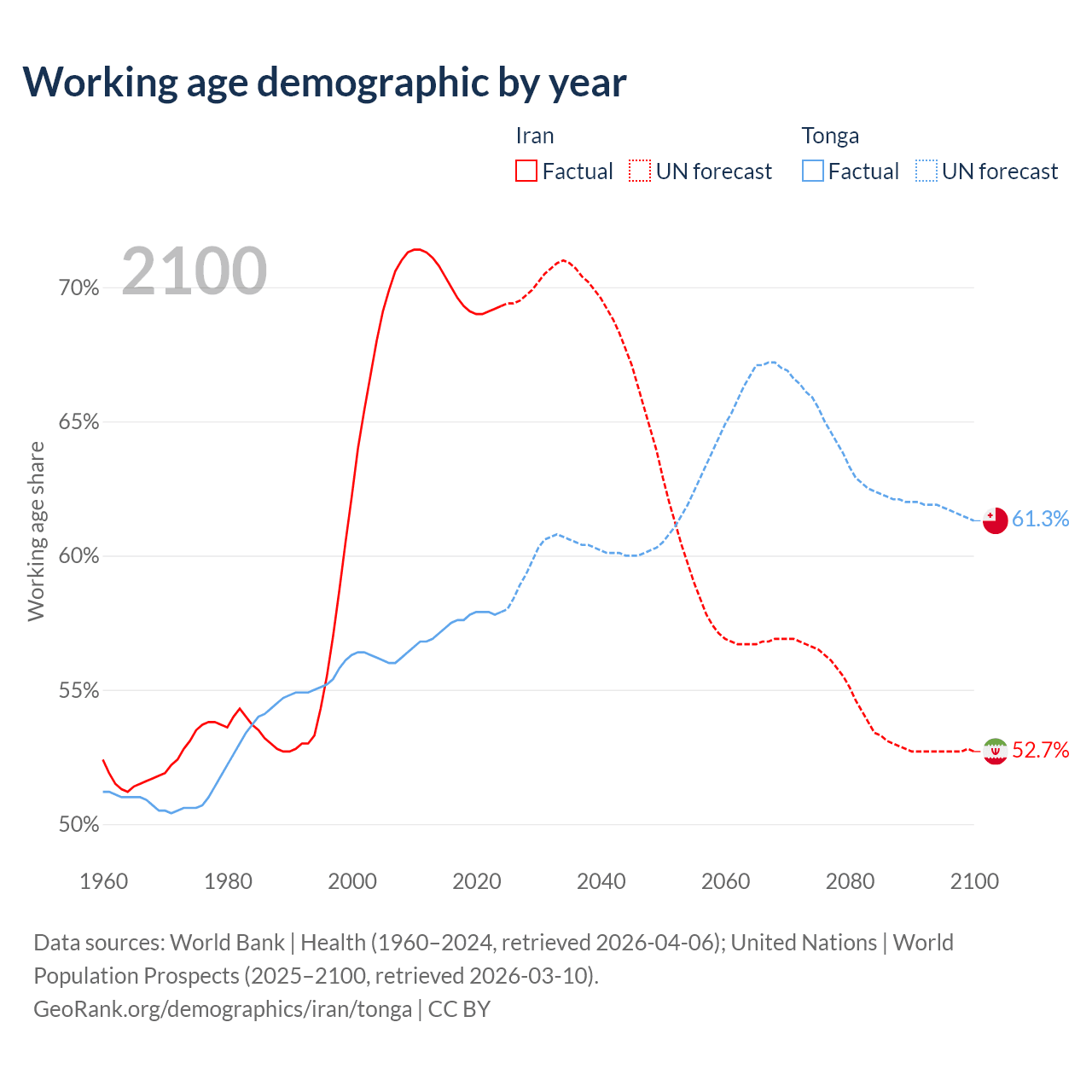 - Iran has 64.8M working age adults (aged 15-64) vs 59.8K in Tonga.