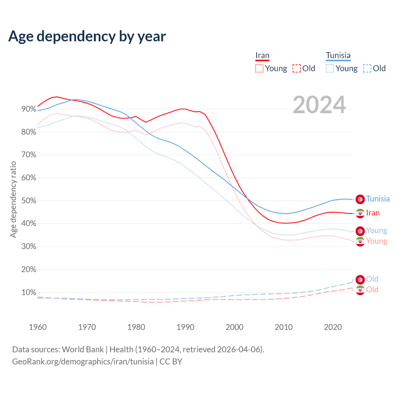 The share of older people aged 65 and over is 8.24% in Iran and 9.53% in Tunisia. Life expectancy in Iran compared to Tunisia .