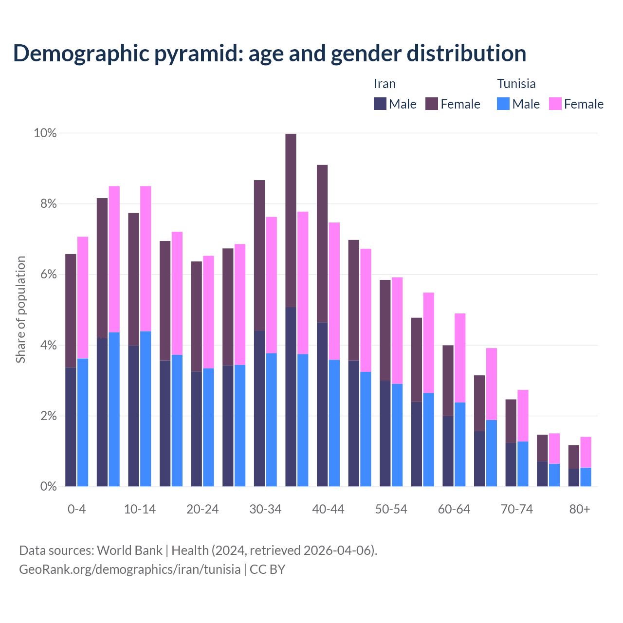- Iran is ranked 79/196 by median age (oldest to youngest) vs 86/196 for Tunisia.