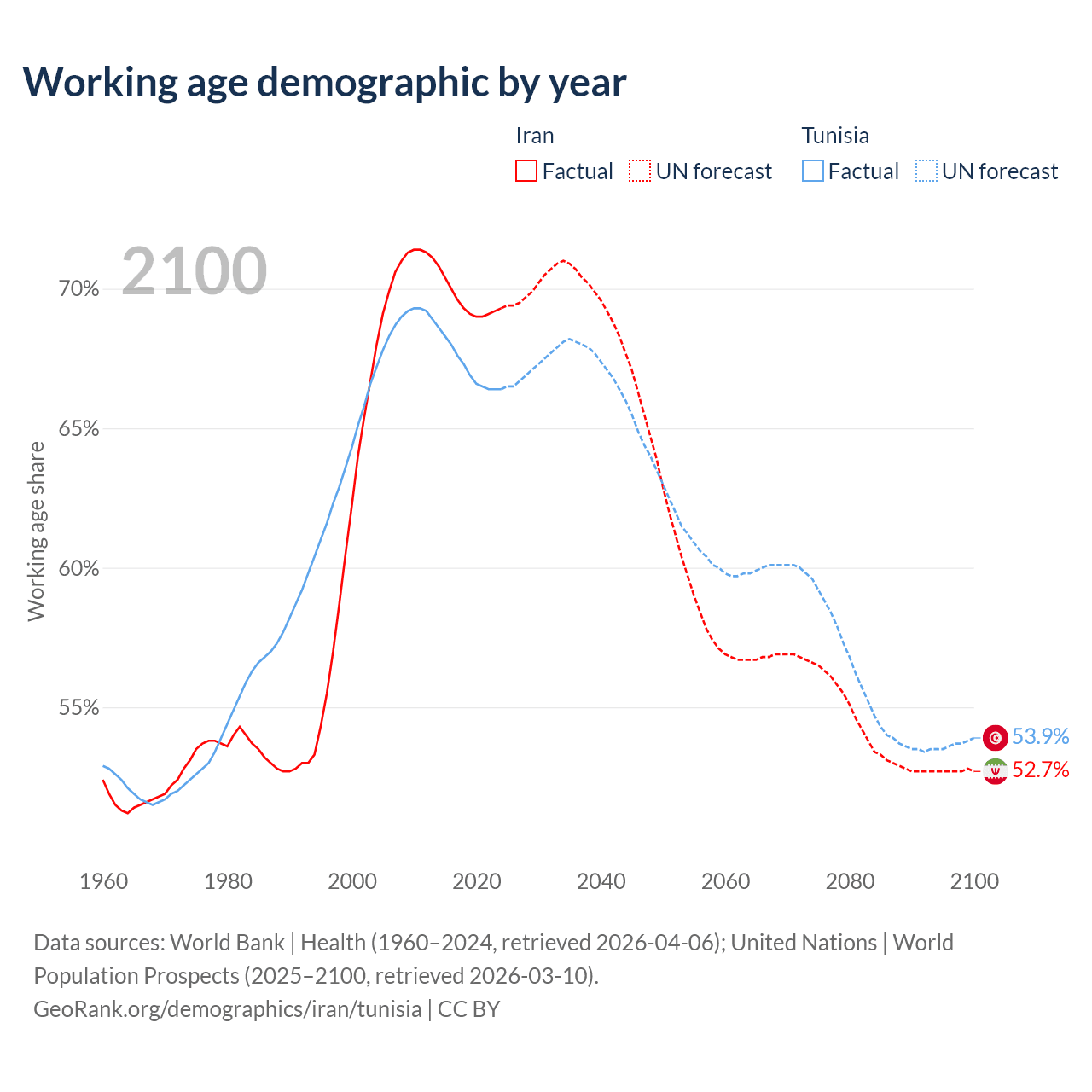 Median age Iran vs Tunisia, 1960-2100