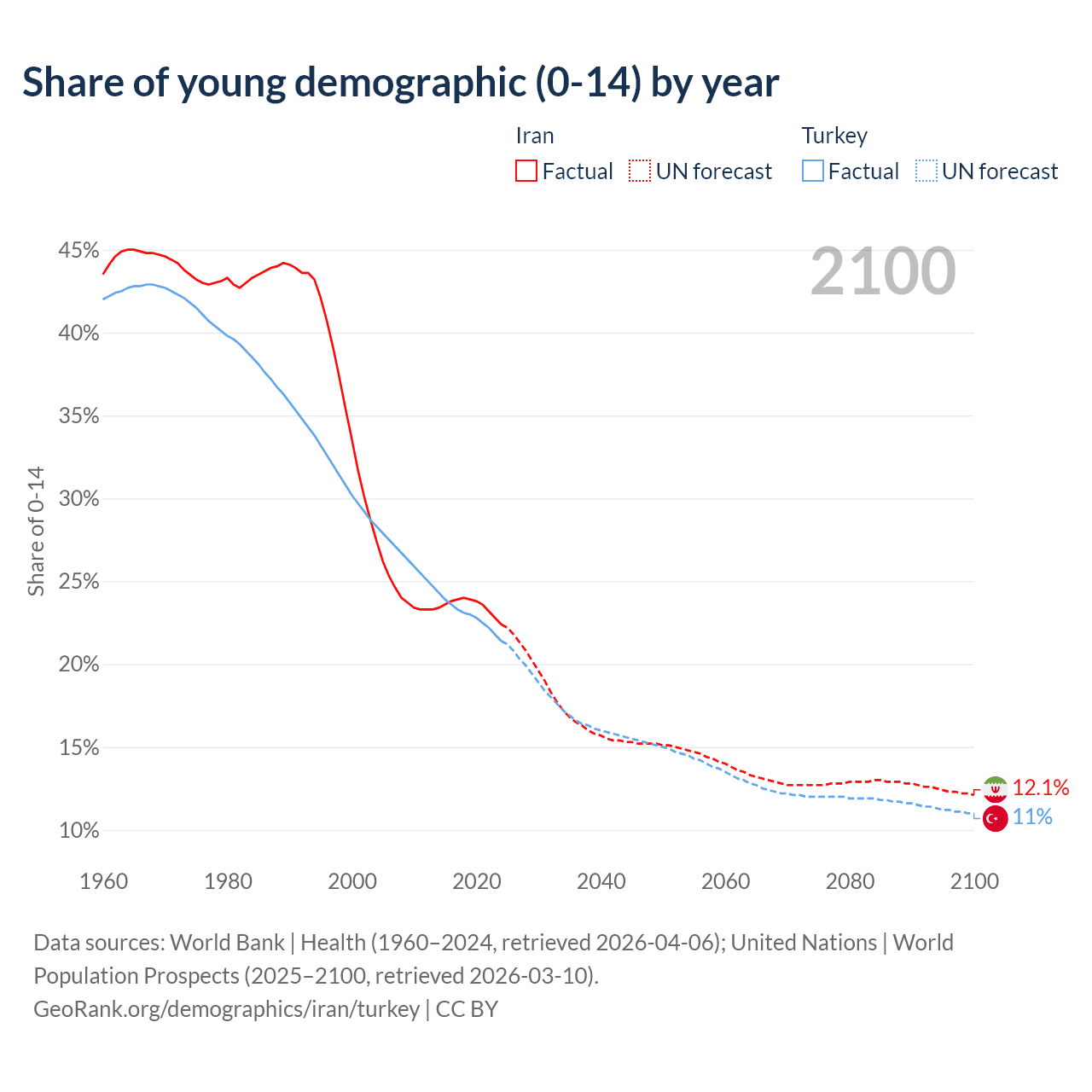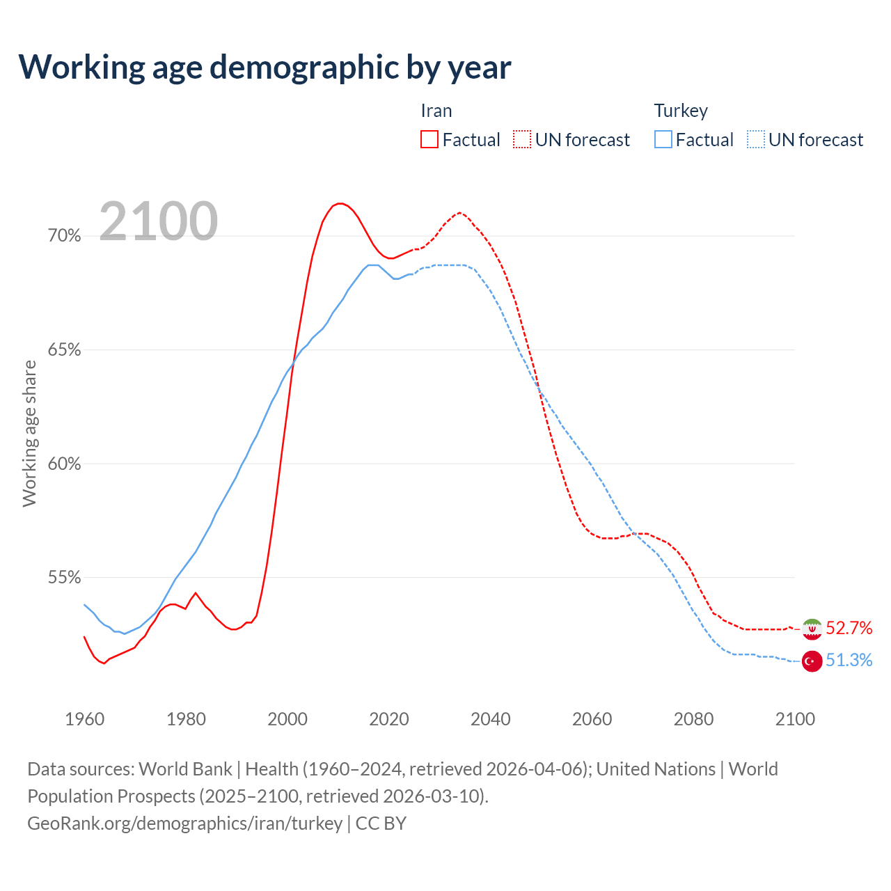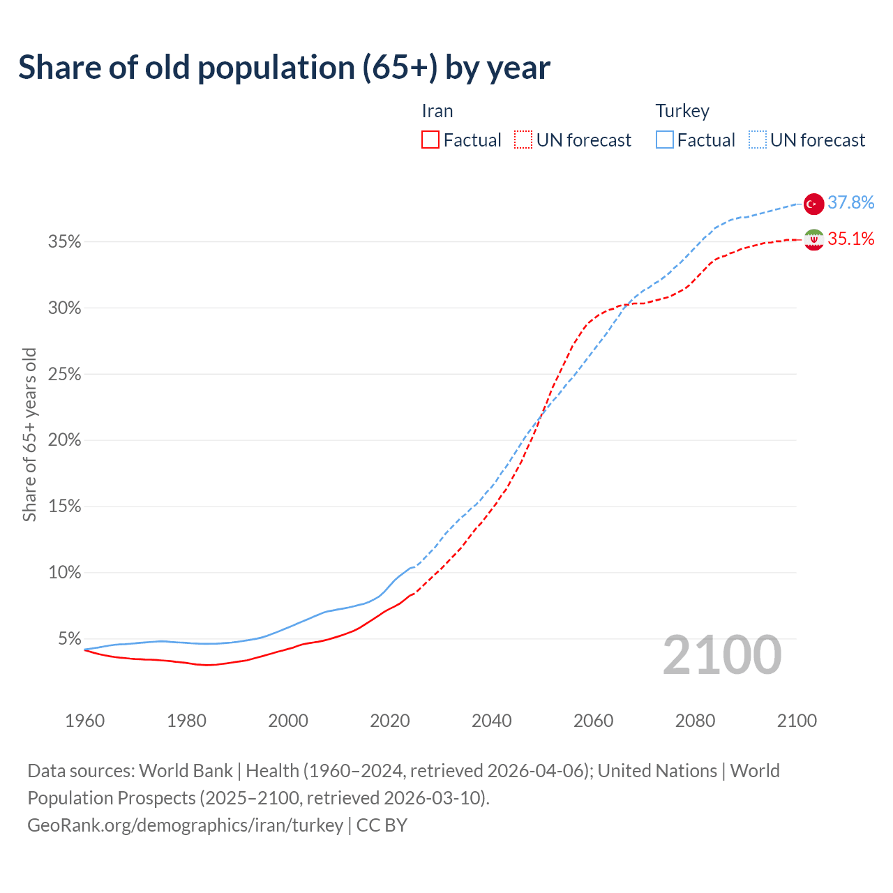 Median age Iran vs Turkey, 1960-2100