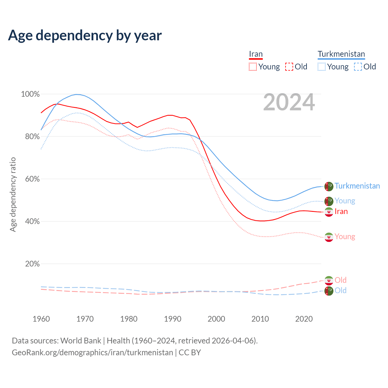 - The share of old-age demographic (65+) in Iran is 8.24% vs 4.53% in Turkmenistan.