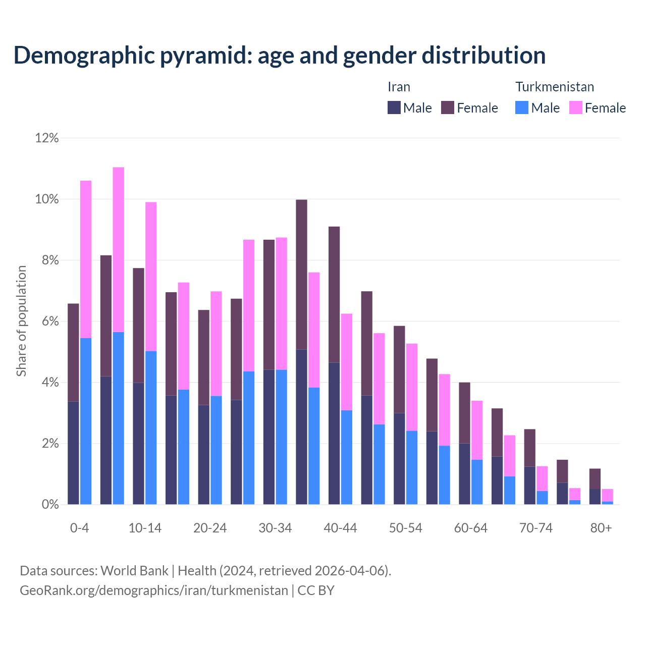 - Iran is ranked 79/196 by median age (oldest to youngest) vs 119/196 for Turkmenistan.