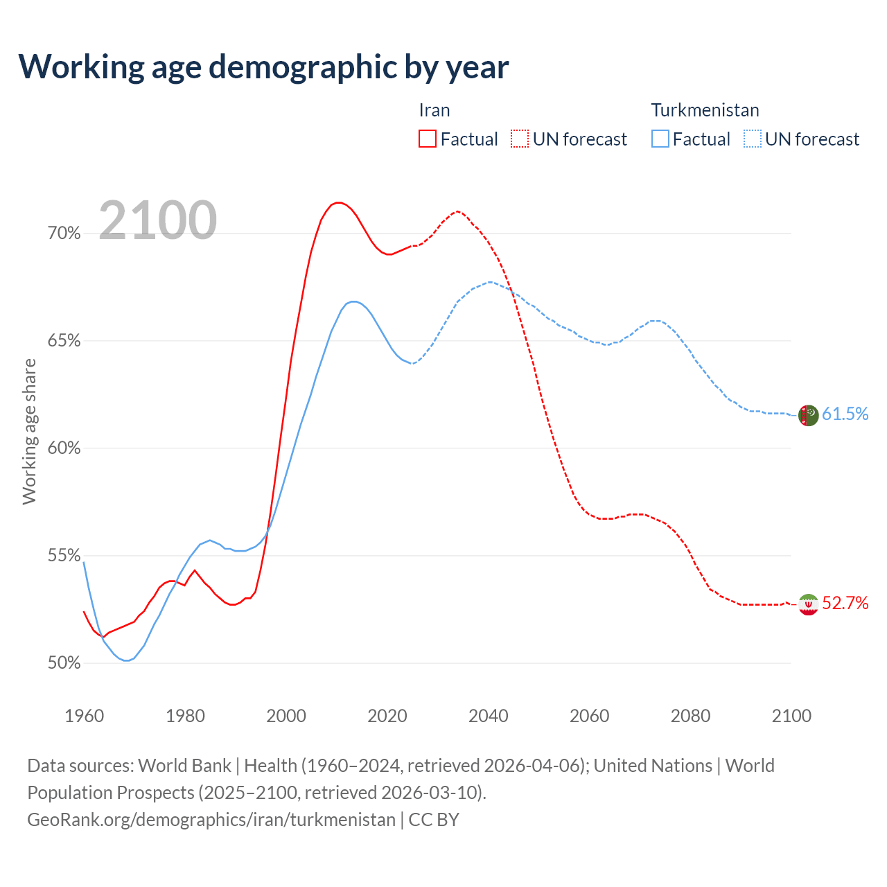 Median age Iran vs Turkmenistan, 1960-2100