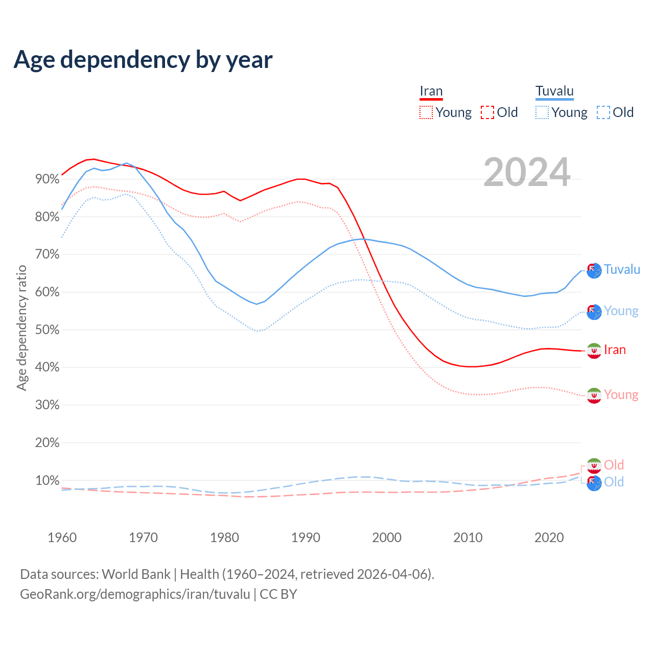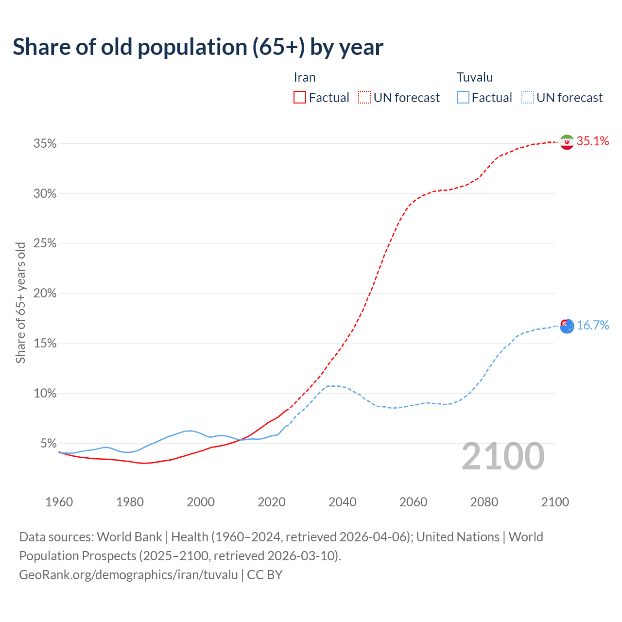 - The share of old-age demographic (65+) in Iran is 8.24% vs 6.67% in Tuvalu.