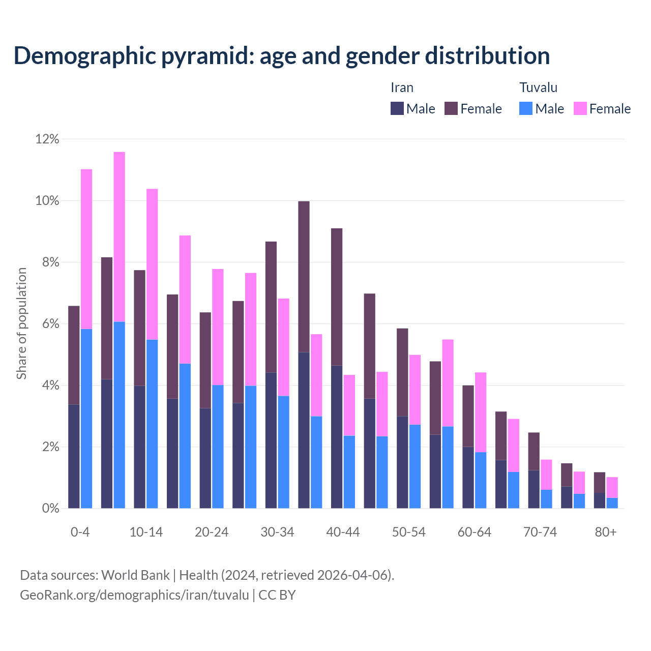 - As of 2026, the population of Iran is 93.5M vs 9.34K in Tuvalu - 10,006 times difference.