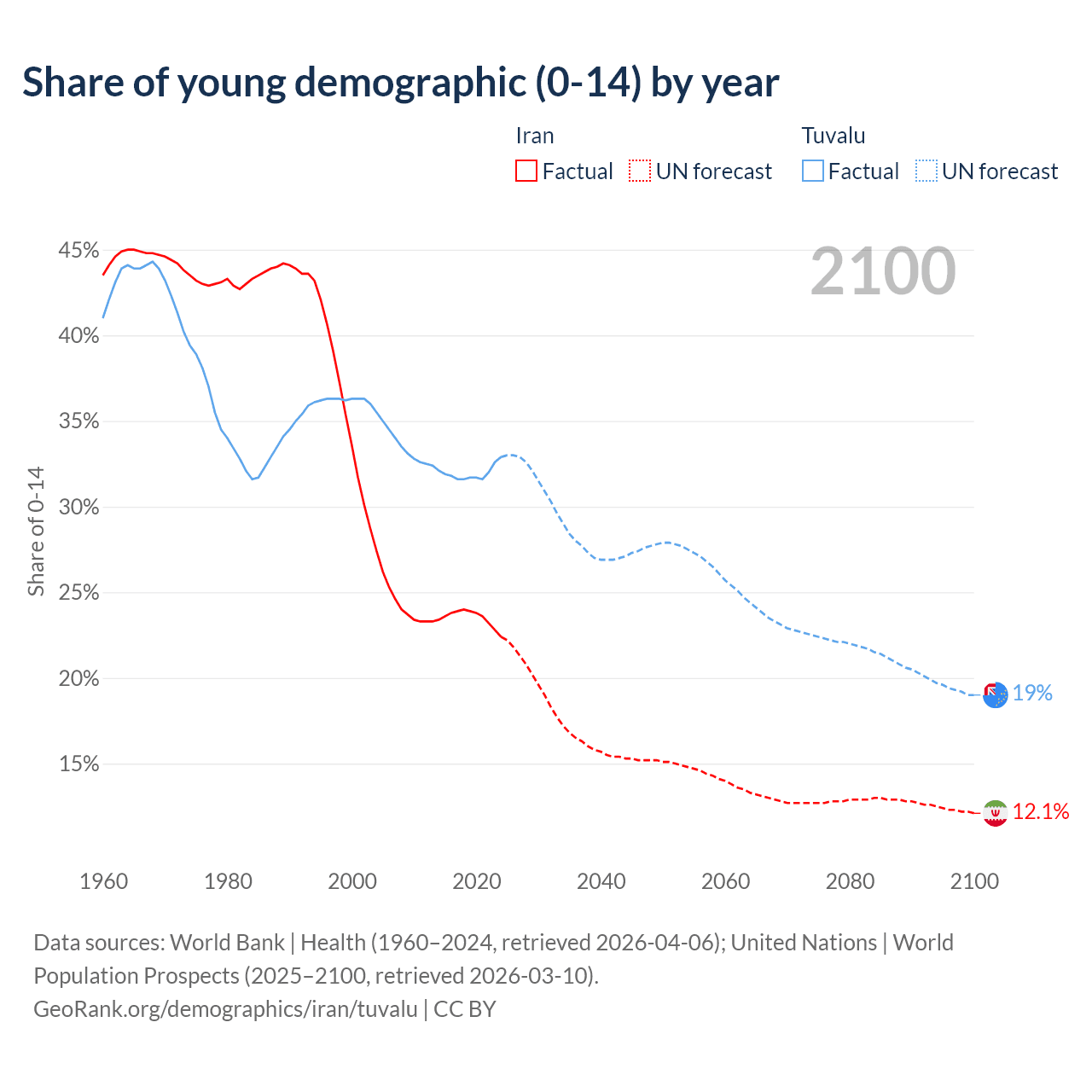 - The share of young demographic (0-15 years old) in Iran is 22.4% vs 32.9% in Tuvalu.
