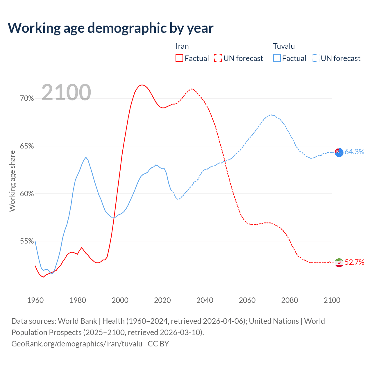 - Iran has 64.8M working age adults (aged 15-64) vs 5.64K in Tuvalu.