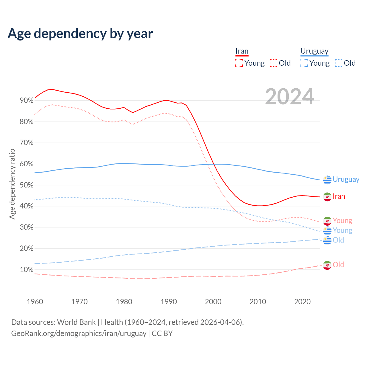 The share of older people aged 65 and over is 8.24% in Iran and 16% in Uruguay. Life expectancy in Iran compared to Uruguay .