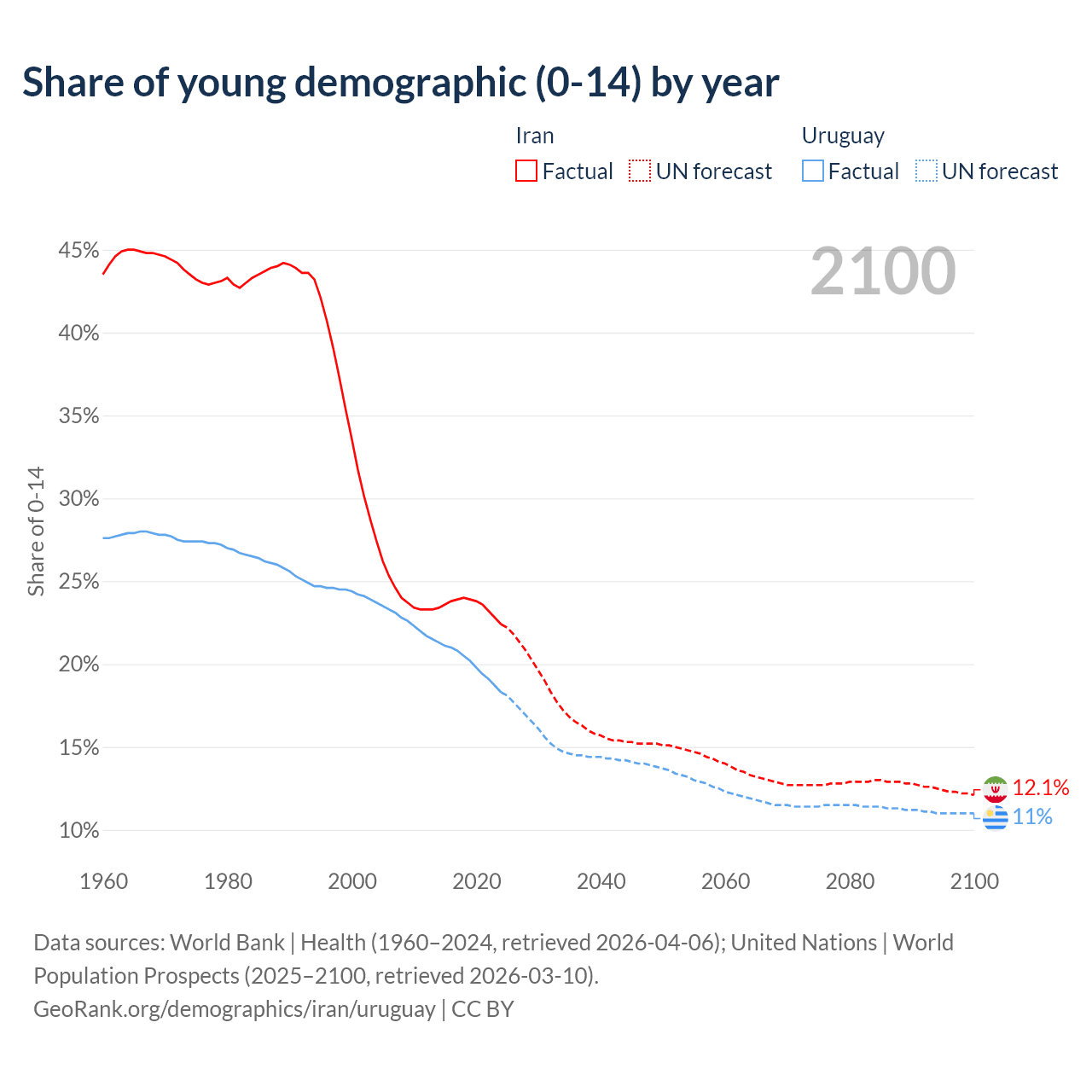 - The share of young demographic (0-15 years old) in Iran is 22.4% vs 18.3% in Uruguay.