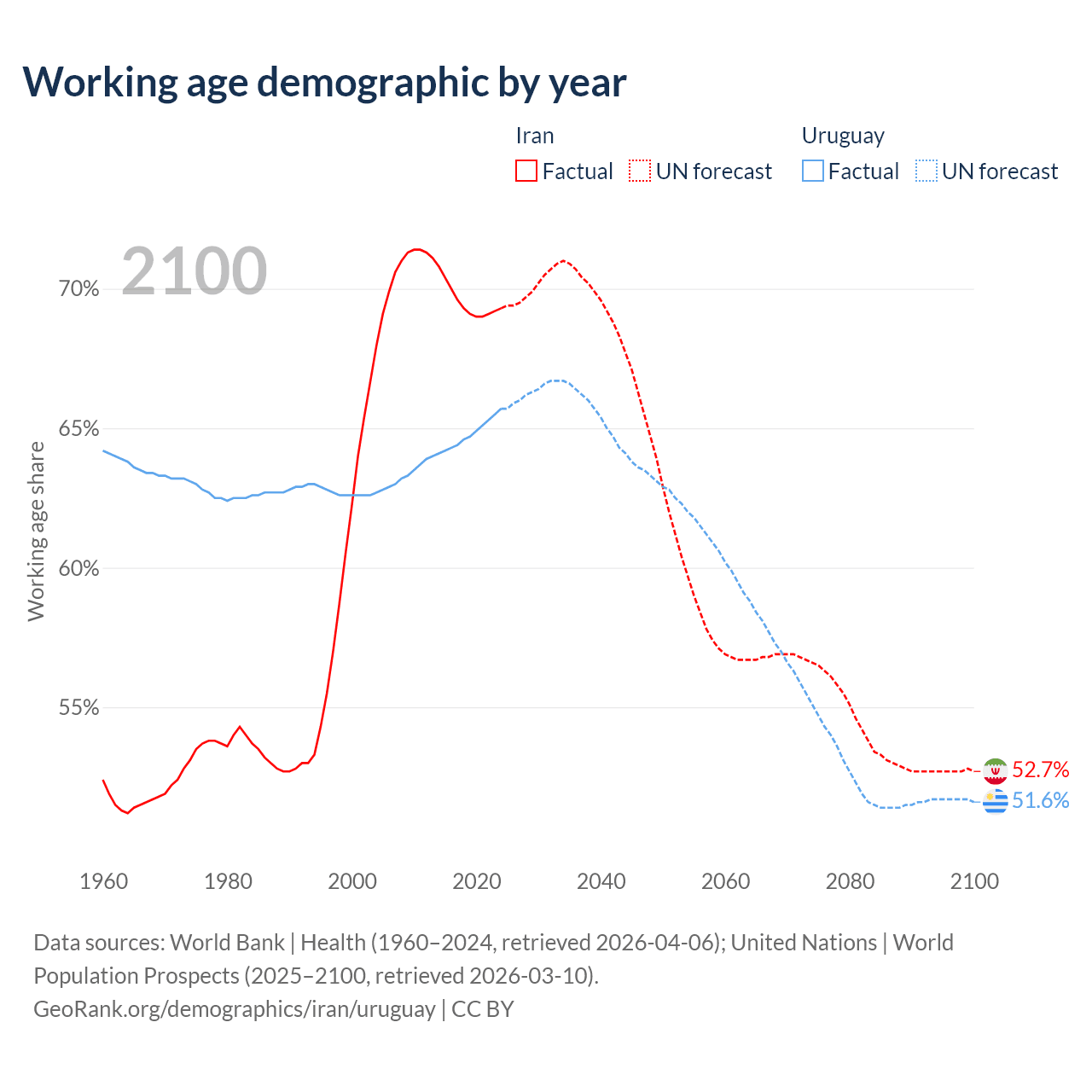Median age Iran vs Uruguay, 1960-2100