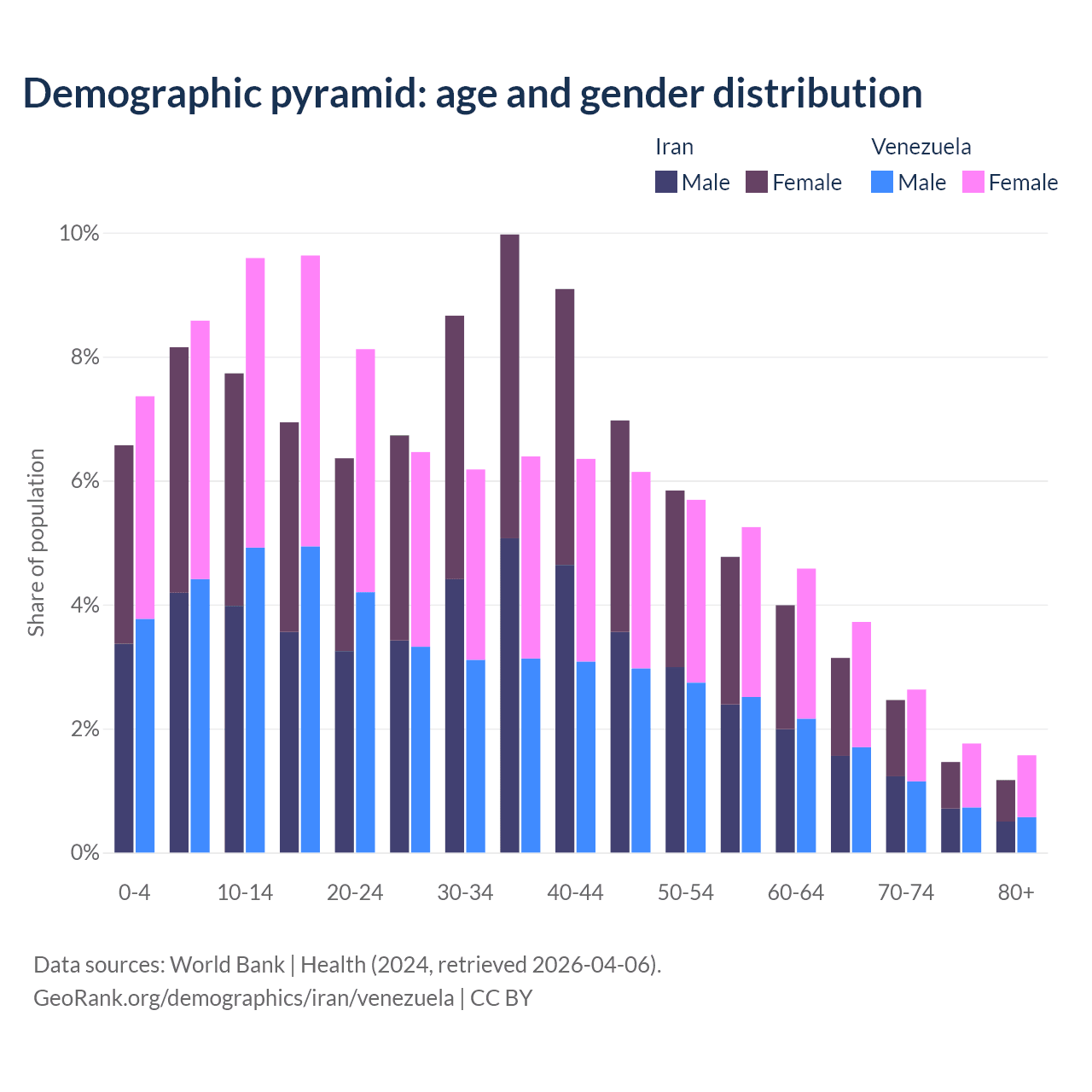 - Iran is ranked 79/196 by median age (oldest to youngest) vs 104/196 for Venezuela.