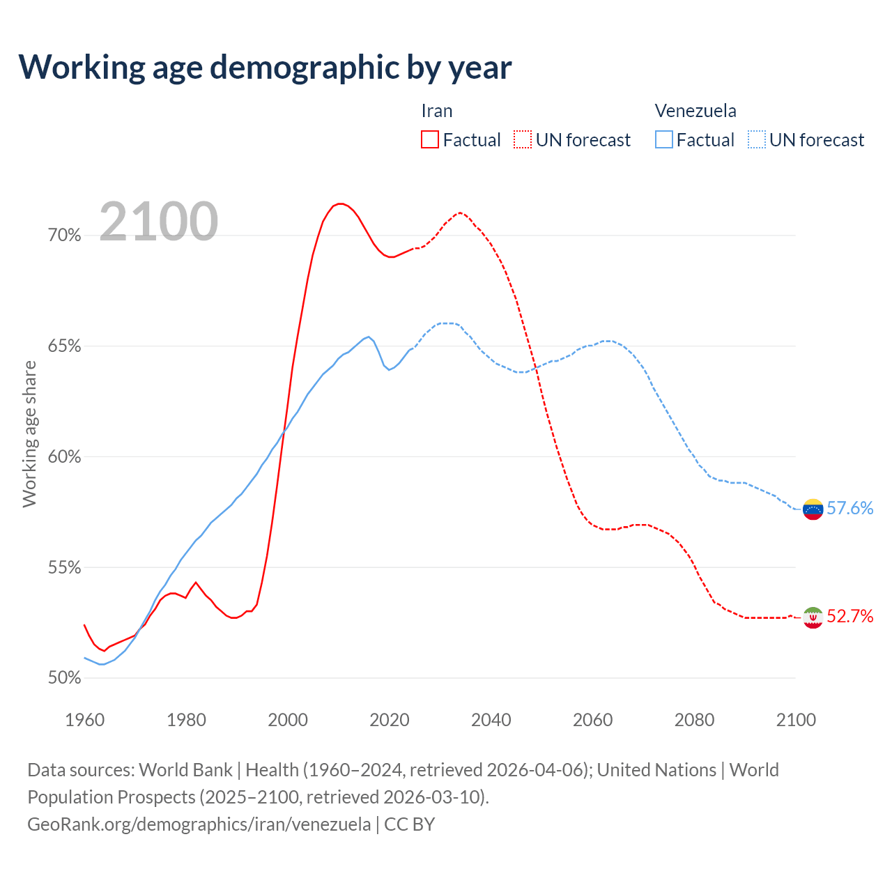 - Iran has 64.8M working age adults (aged 15-64) vs 18.6M in Venezuela.
