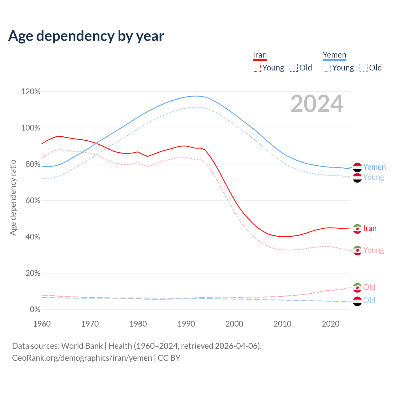 - The share of old-age demographic (65+) in Iran is 8.24% vs 2.52% in Yemen.