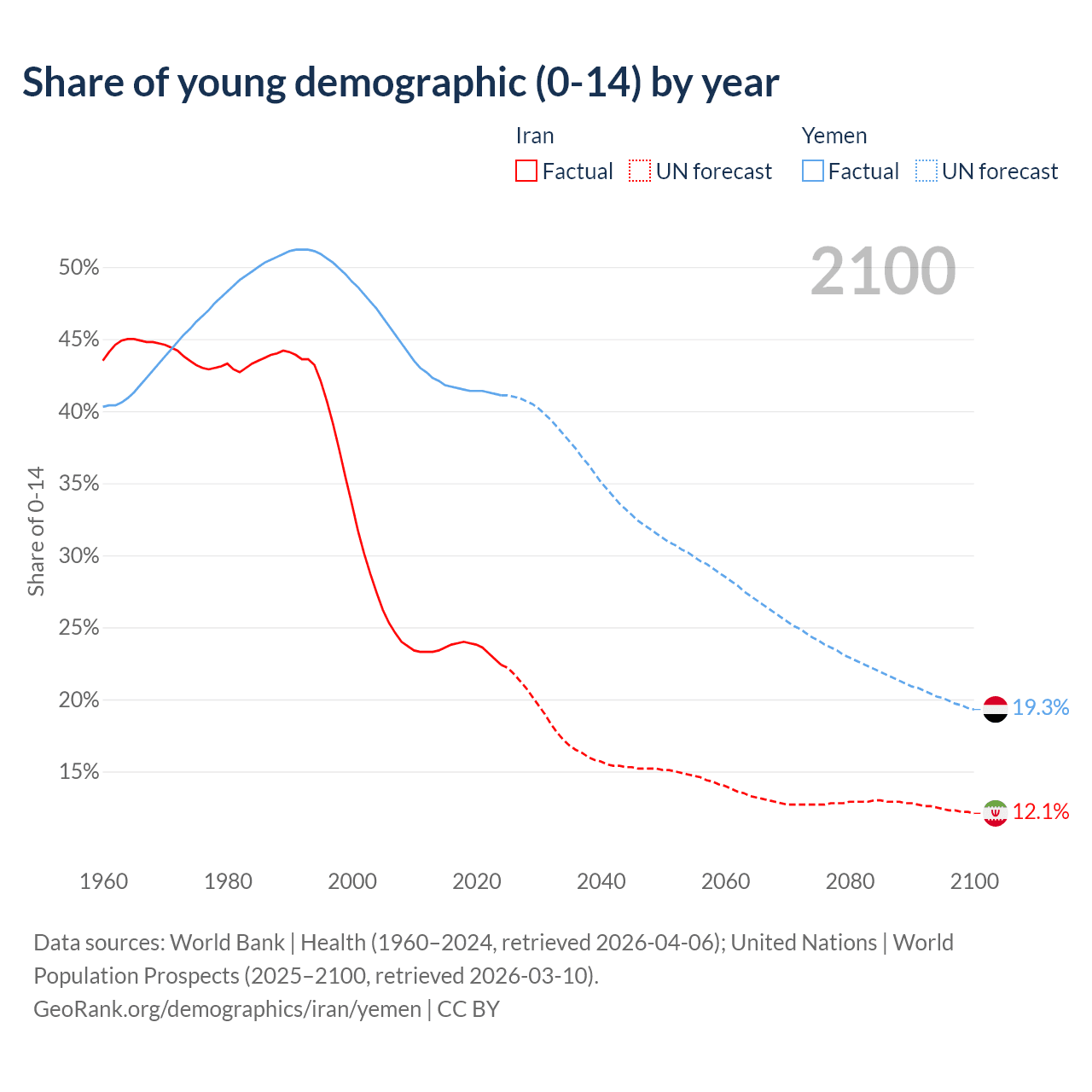 - The share of young demographic (0-15 years old) in Iran is 22.4% vs 41.1% in Yemen.