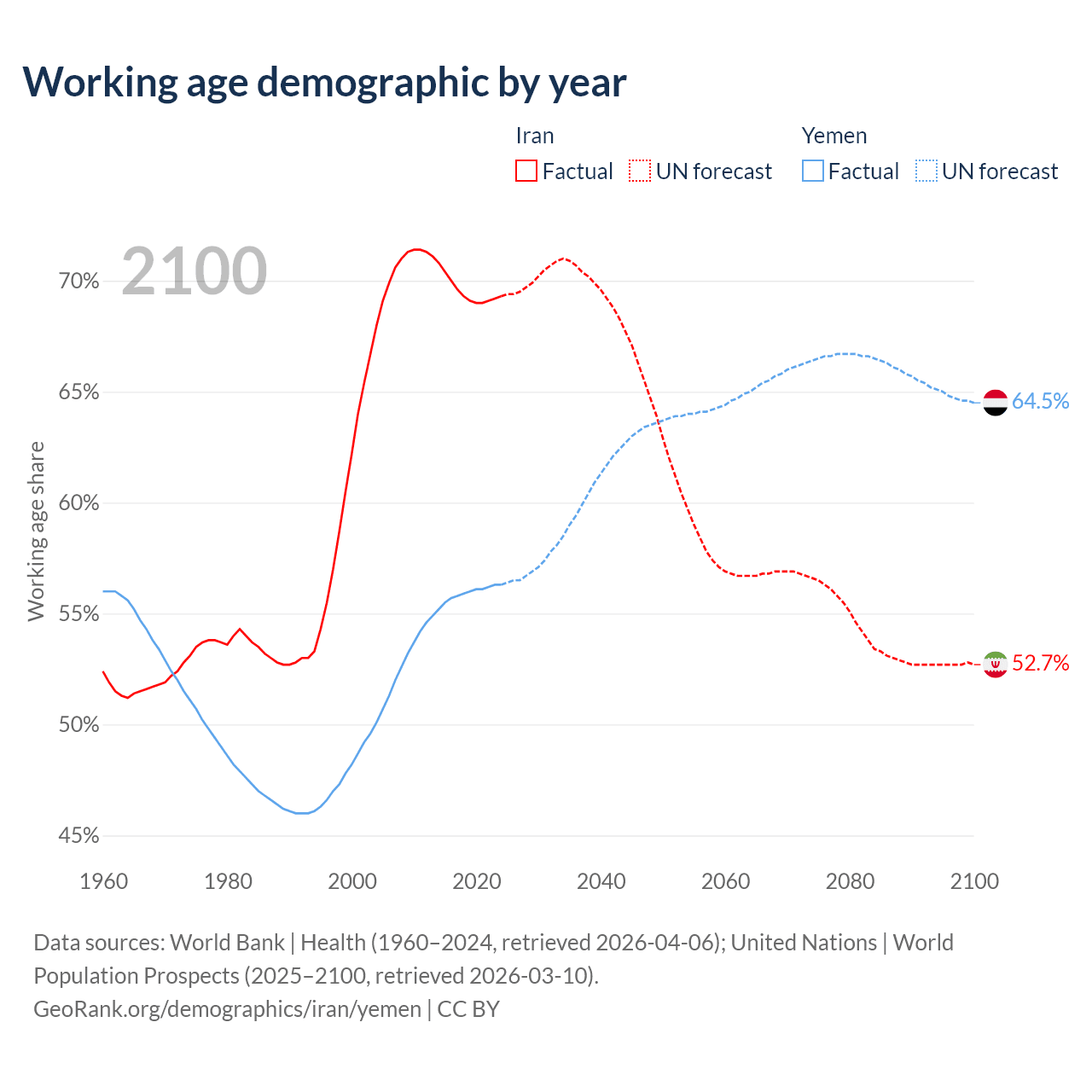 - Iran has 64.8M working age adults (aged 15-64) vs 24.4M in Yemen.