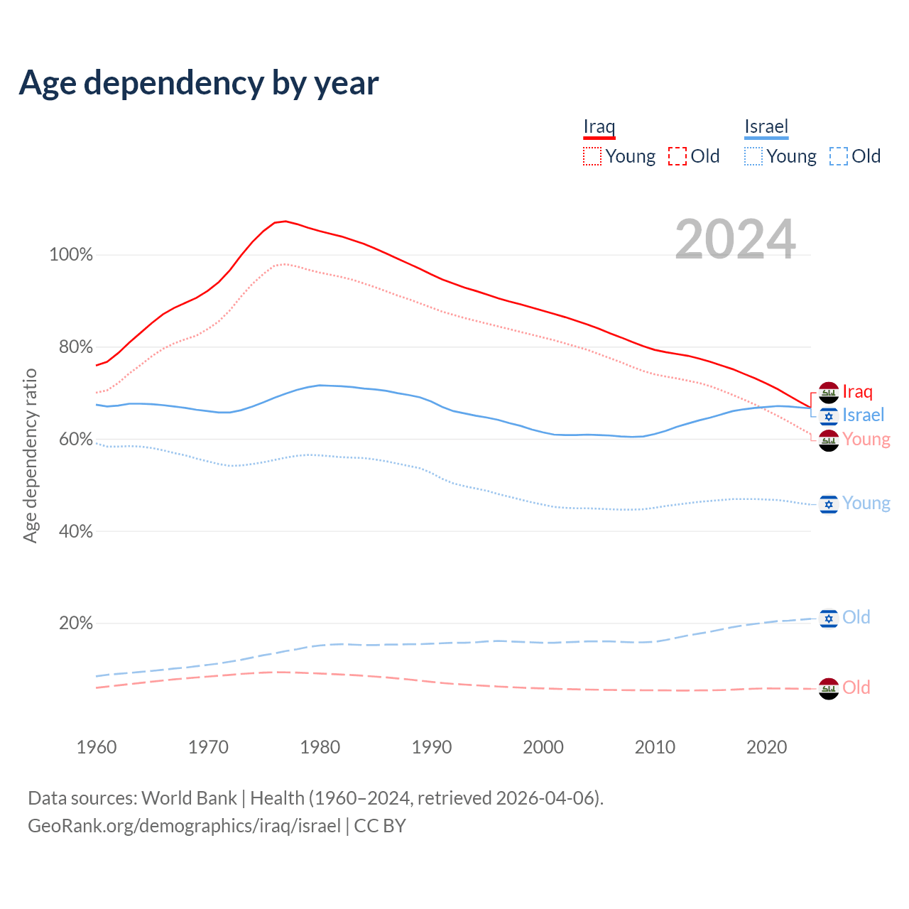 - Iraq is ranked 151/196 by median age (oldest to youngest) vs 103/196 for Israel.