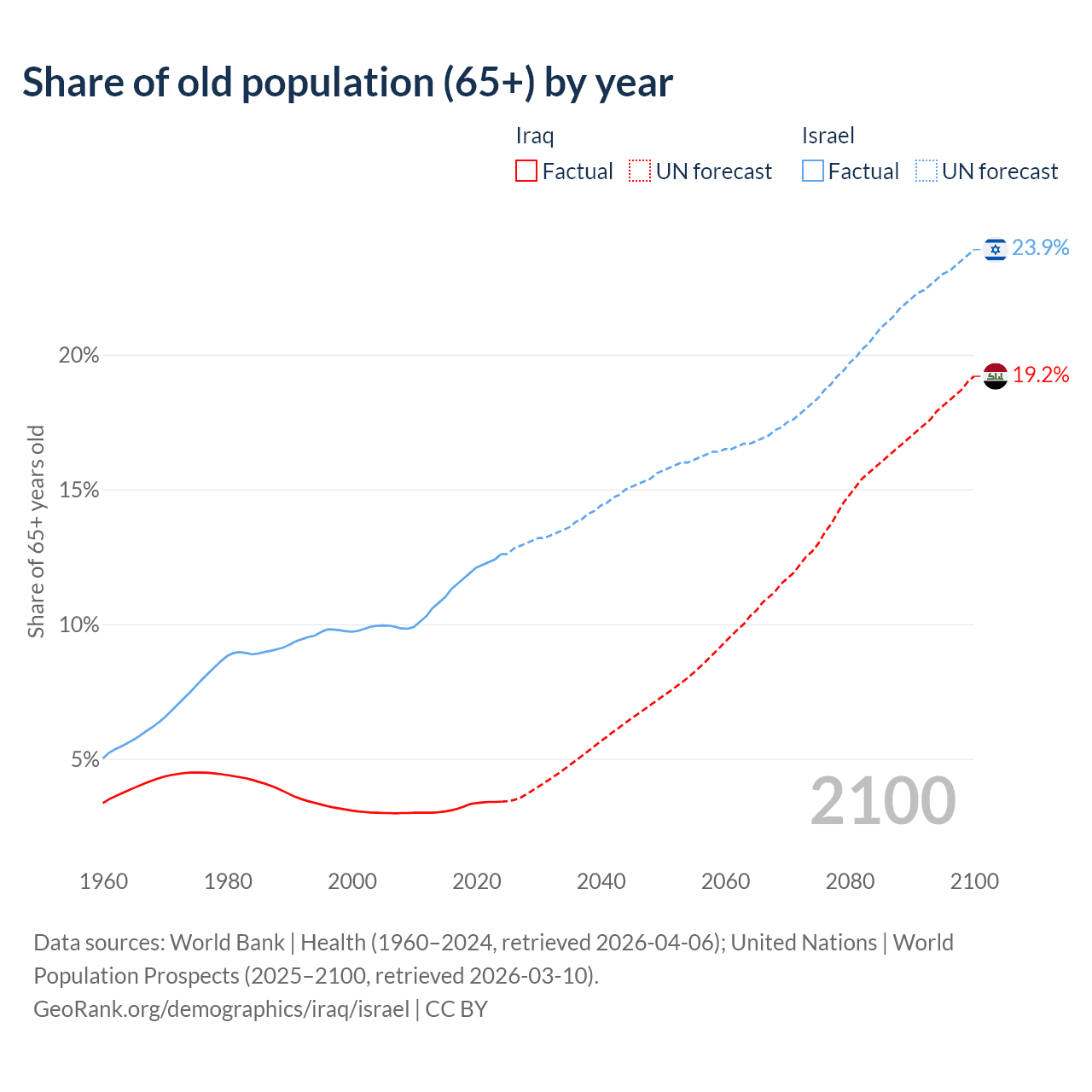 The share of older people aged 65 and over is 3.41% in Iraq and 12.6% in Israel. Life expectancy in Iraq compared to Israel .