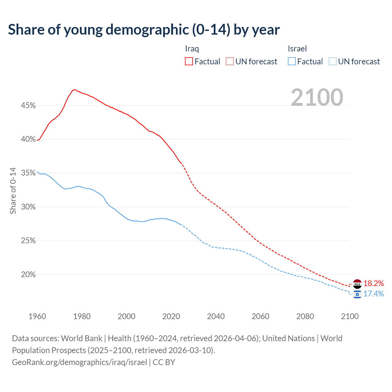 - The total fertility rate is 3.25 in Iraq compared to 2.85 in Israel.